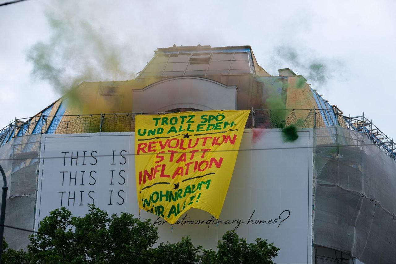 Im Zuge der Demonstration haben Aktivist*innen der Gruppe "Zwangsräumungen verhindern" ein Banner von einem Gemeindebau am Donaukanal in der Nähe des Demonstrationsstartpunkts gehängt mit der Aufschrift "Trotz SPÖ und alledem: Revolution statt Inflation - Wohnraum für alle!".