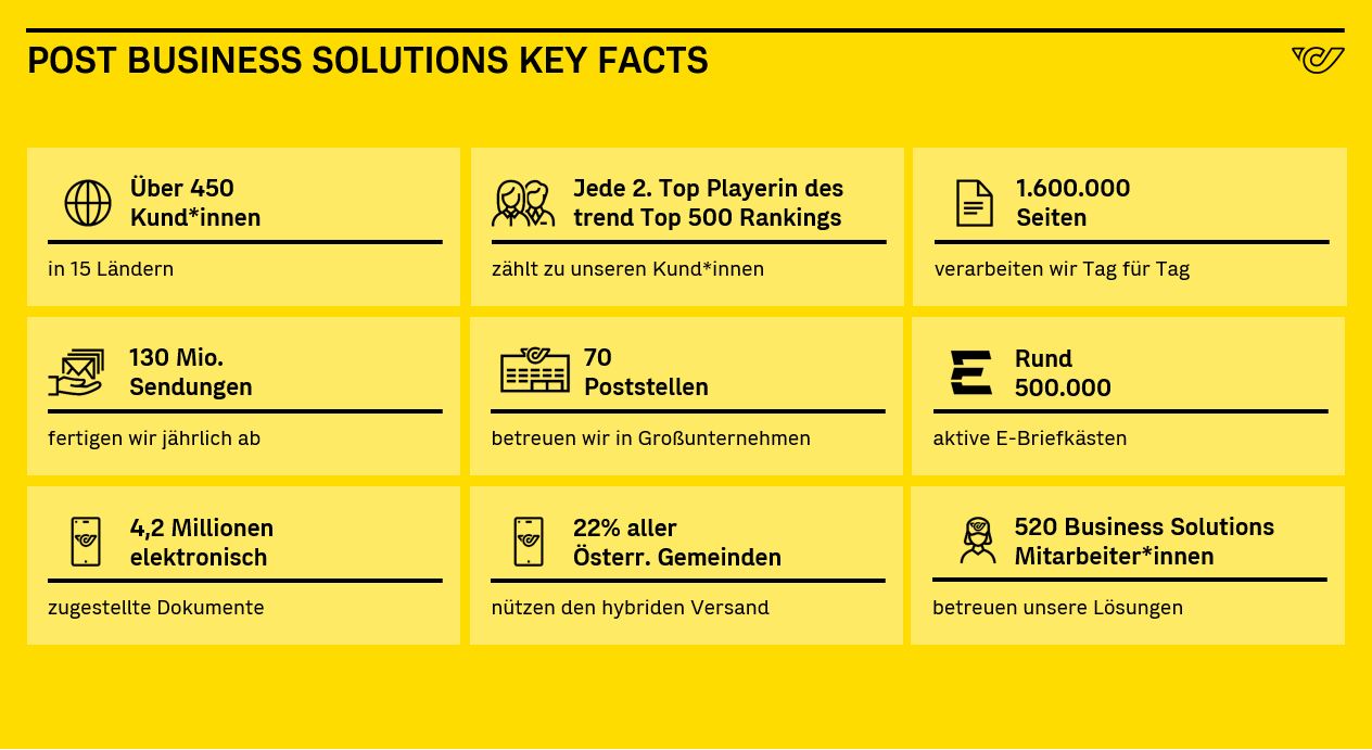 Vier Tochterunternehmen der Österreichischen Post AG – Scanpoint, EMD, D2D und sendhybrid – bearbeiten jeden Tag 1,6 Millionen Seiten für 450 Geschäftskund*innen aus acht Ländern, vor allem aus den Bereichen öffentliche Verwaltung, Banken, Versicherungen, Telekommunikations- und Industrieunternehmen. Um Geschäftskund*innen stärker auf dem Weg in eine wettbewerbsfähige Zukunft zu begleiten, wurden die vier bestehenden Tochtermarken unter der gemeinsamen Marke „Post Business Solutions“ vereint. Damit festigt die Post ihre Position auf dem österreichischen Markt als erfahrene und zuverlässige Partnerin von Unternehmen beim Analysieren, Auslagern und Automatisieren von Informations- und Geschäftsprozessen.