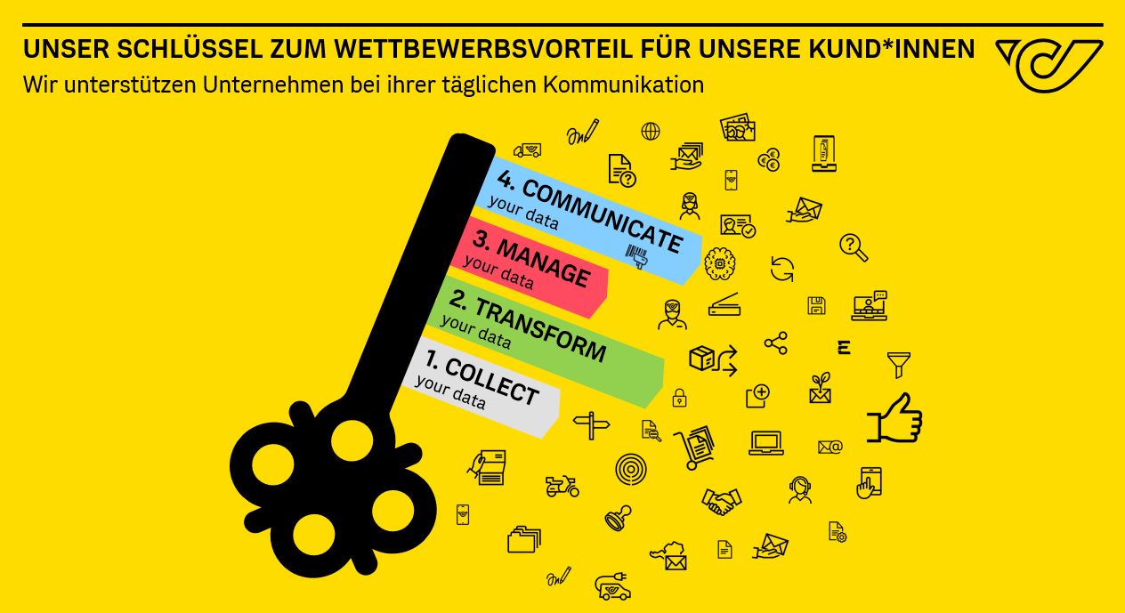 Die Post Business Solutions liefert österreichischen und internationalen Unternehmen Lösungen zur Optimierung, Digitalisierung und Automatisierung von Geschäftsprozessen im Dokumenten- und Informationsmanagement. Die vielfältigen Leistungen der Dokumenten-Outsourcing-Playerin umfassen den gesamten Nutzungszyklus von Informationen von innen nach außen und innerhalb eines Unternehmens. Dieser Zyklus wird in vier Schritten umgesetzt: von der Abholung und Zustellung von Brief- und Postsendungen („Collect your data“) über die digitale Transformation von Dokumenten („Transform your data“) und das Dokumentenmanagement („Manage your data“) bis hin zur Optimierung der Kund*innenkommunikation („Communicate your data“). Dabei macht die Post Business Solutions aus dem Aufwand ihrer Kund*innen in Dokumenten- und Informationsprozessen einen entscheidenden Wettbewerbsvorteil für ihr Unternehmen und hebt Qualitätsverbesserungs- und Kosteneinsparungspotenziale. Als Sparringspartnerin für Geschäftsprozesslösungen begleitet sie ihre Kund*innen auf dem Weg in eine digitale und nachhaltige Zukunft.