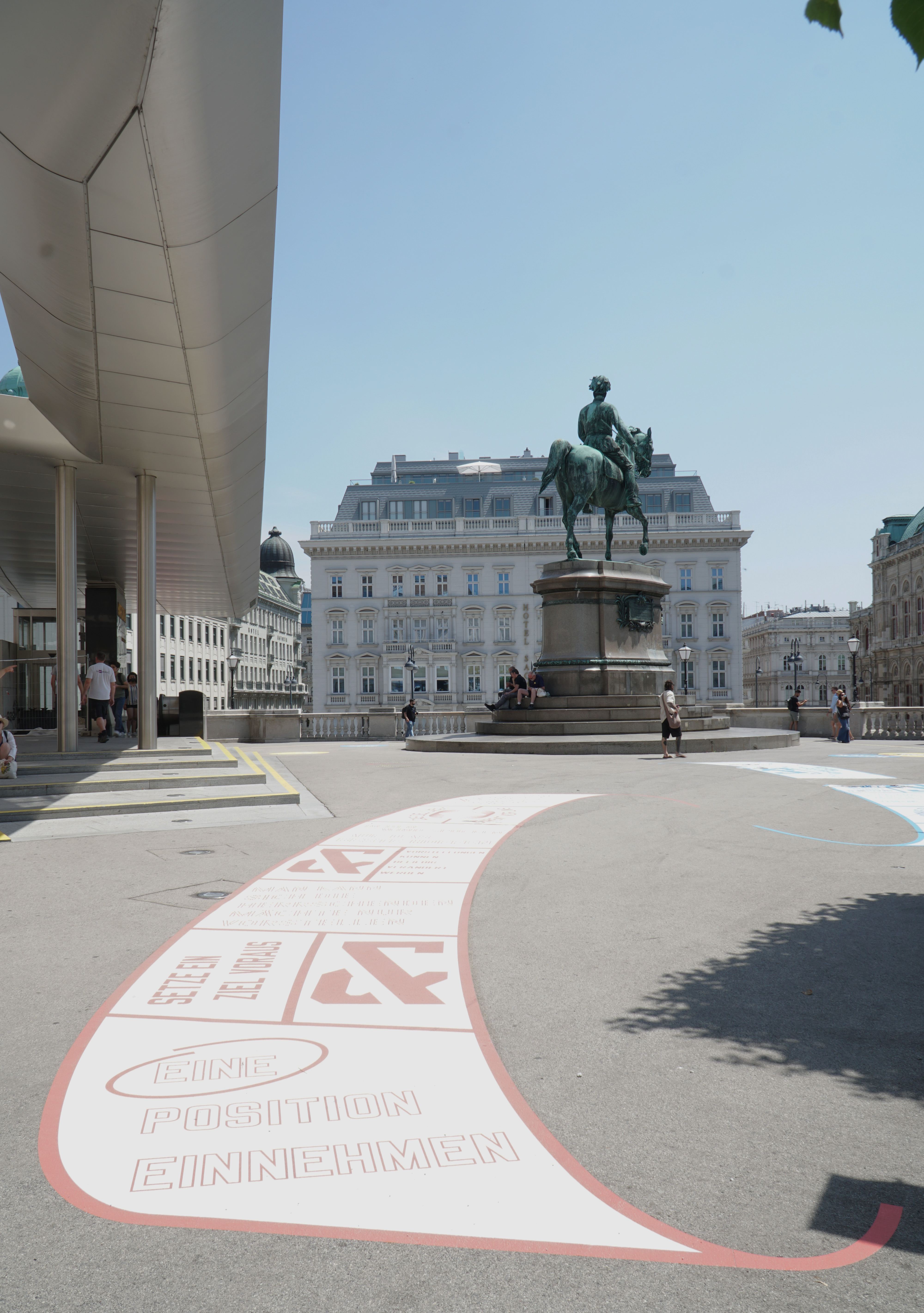 Die ALBERTINA zeigt ab dem 29. Juni eine Bodeninstallation des bekannten US-amerikanischen Künstlers Lawrence Weiner auf der Bastei vor dem Haupteingang. OUT OF SIGHT erinnert auf den ersten Blick an klassische Kinderhüpfspiele wie „Himmel und Hölle“ und lädt auf dem Vorplatz des Museums zu leichtfüßigem Nachdenken ein.