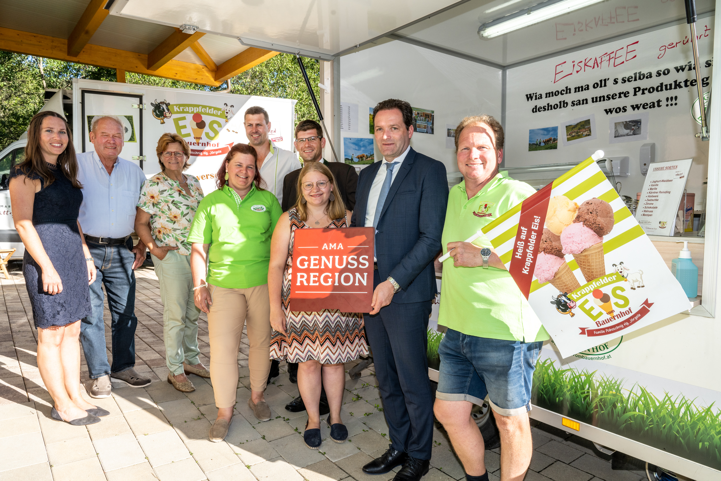 „Regionalität und Qualität – dafür stehen Österreichische Betriebe, die täglich heimische Lebensmittel nach höchsten Standards erzeugen und verarbeiten. Und genau diese Werte wollen wir noch stärker vor den Vorhang holen“, betonen Landwirtschaftsminister Norbert Totschnig und Landesrat Martin Gruber. Gemeinsam haben sie den Betrieb der Familie Pobaschnig „Krappfelder Eis vom Bauernhof“ und den bäuerlichen Milchhof „Sonnenalm“ mit dem neuen Gütesiegel AMA GENUSS REGION zertifiziert. Immer mehr Menschen wollen wissen, woher ihre Lebensmittel kommen. Um regionale Qualität zu stärken, wurde auf Initiative des Landwirtschaftsministeriums das neue Gütesiegel AMA GENUSS REGION erarbeitet. Laufend steigen Betriebe in ganz Österreich in das neue System ein, die stolz darauf sind, ebenfalls als regionaler Qualitätsbetrieb zertifiziert zu sein.
