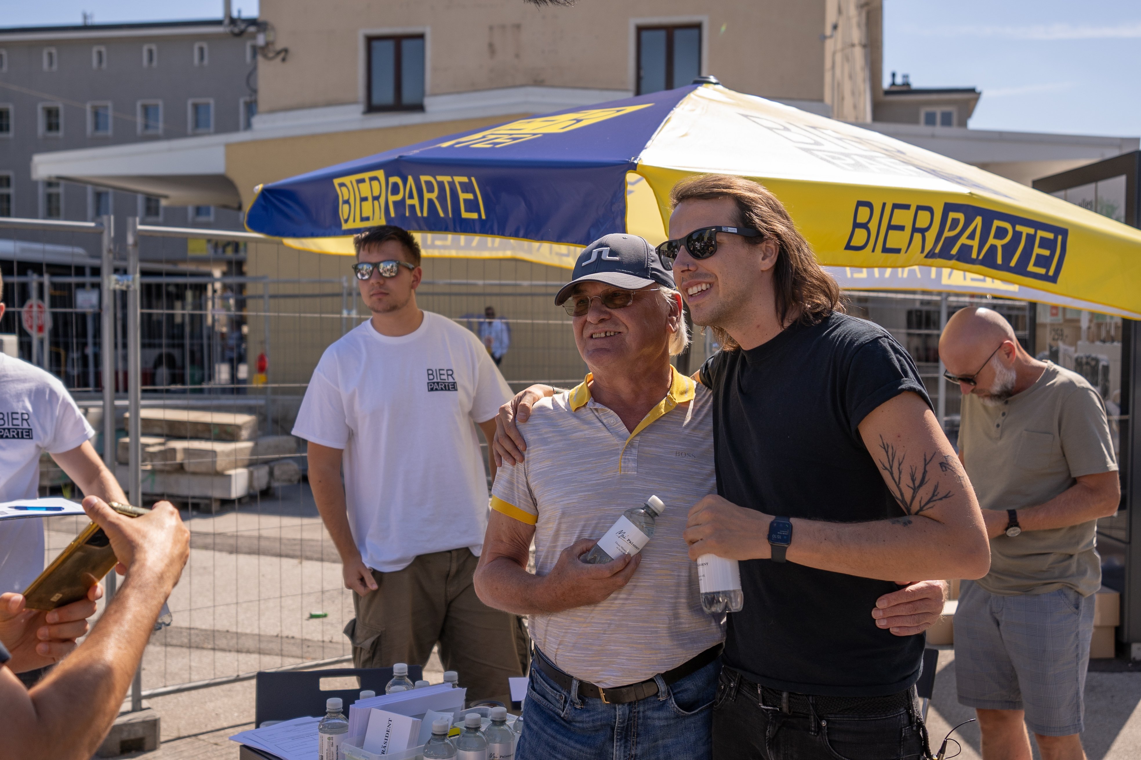 Der Linzer Stützpunkt der Bierpartei befindet sich unübersehbar mit blau-gelben Sonnenschirmen und Fahnen in der Kärntner Straße vis-à-vis vom Wissensturm und ist bis 02.09. Montag bis Donnerstag 10-18 Uhr und Freitag 10-14 Uhr besetzt. Dort unterstützen Freiwillige, die bürokratischen Hürden der „Unterschreiberei“ zu meistern. Apropos: Unterschreiben kann jede:r Österreicher:in ab 16 Jahren, der/die am Stichtag (09.08.2022) wahlberechtigt ist. Die Unterstützungserklärung muss vom jeweiligen Gemeindeamt des Hauptwohnsitzes beglaubigt werden. Diese Erklärung muss danach im Original an die Bierpartei geschickt bzw. an eine:n der Helfer:innen der Bierpartei überreicht werden. Nach Graz und Linz wird Dominik Wlazny auch Salzburg und Innsbruck besuchen, die Termine sowie weitere Stationen werden rechtzeitig bekanntgegeben.