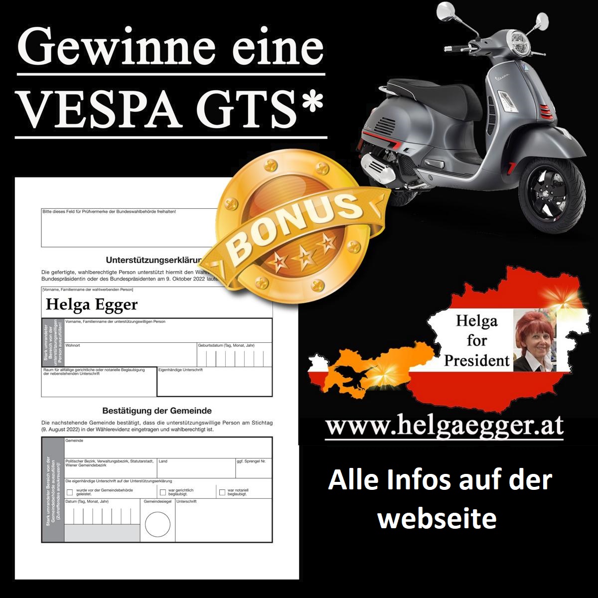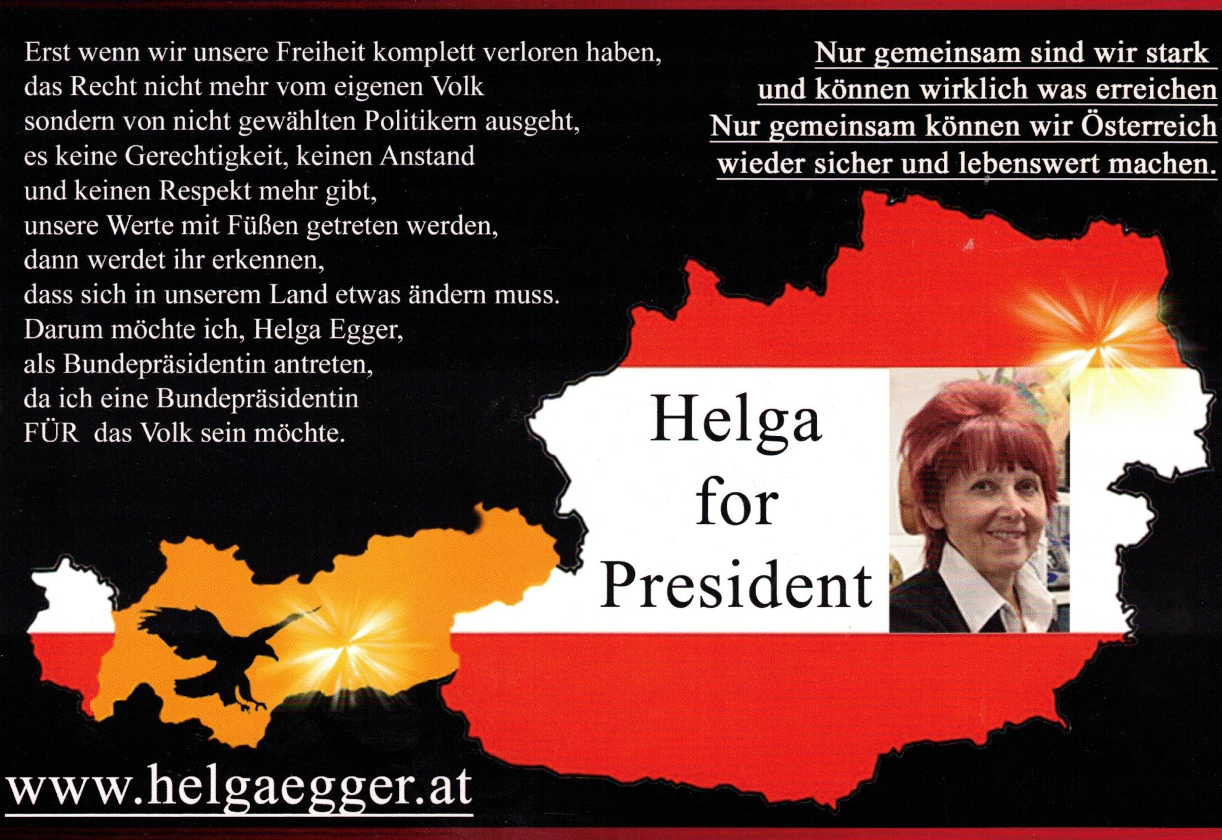 Ich, Helga Egger, möchte Bundespräsidentin werden, weil ich alles versuchen würde, um Österreich wieder sicher und lebenswert zu machen. So viele Menschen haben ihr Vertrauen in die Politik komplett verloren, auch ich. Politik muss endlich wieder für die Menschen gemacht werden. Deshalb habe ich dann, als einfacher Mensch aus dem Volk, der wirklich sein ganzes Leben immer nur gearbeitet hat, sich alles selber erarbeiten musste, entschlossen und überwunden, antreten zu wollen, was kein leichter Schritt für mich war. Leider erhalte ich auf fb auch einige sehr negative Eintragungen unterster Schublade, was mich am Anfang schon sehr verletzt hat, aber was gibt diesen Menschen das Recht dazu, was haben diese Menschen in ihrem Leben wirklich geleistet? Es wurde sehr sehr schwer gemacht, die 6.000 Unterstützungserklärungen in dieser kurzen Zeit erhalten zu können. Da ich parteilos, somit komplett unabhängig bin und keine großen Geldgeber hinter mir stehen habe, musste ich mir nun auch etwas Besonders einfallen lassen, sodass ich Menschen doch noch dazu bewegen kann, zu den Gemeinden hinzugehen. Viele Menschen sind leider einfach so träge, so gleichgültig geworden. Wenn ich 6.100 Unterschriften erhalten habe, dann verlose ich eine neue Vespa, entweder 125 oder 300 ccm, Farbe wählbar. Alle Infos finden Sie unter: www.helgaegger.at