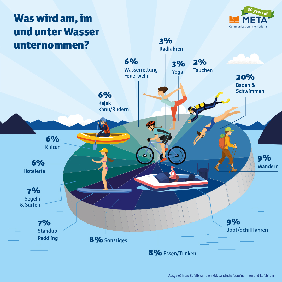 Eine ausgewählte Stichprobe von über 1.100 Beiträgen wurde dahingehend ausgewertet, was auf den Bildern zu sehen ist. Es zeigt sich: Österreichs Seen haben sehr viel zu bieten. Spitzenreiter bei den erfassten Tätigkeiten ist zwar erwartungsgemäß „Baden & Schwimmen“, jedoch haben vier von fünf Beiträgen andere Tätigkeiten als Motiv. User und Userinnen zeigen sich beim Segeln, Surfen, Wasserskien und Stand-Up-Paddling; oder etwas ausgefallener beim Drachenbootfahren oder Skijaking. Die traditionellen Weisenbläser am Goldegger See und die Fronleichnamsprozession am Hallstätter See sorgen für die bemerkenswerte Kombination der Kategorien „Kultur“ und „Rudern“.