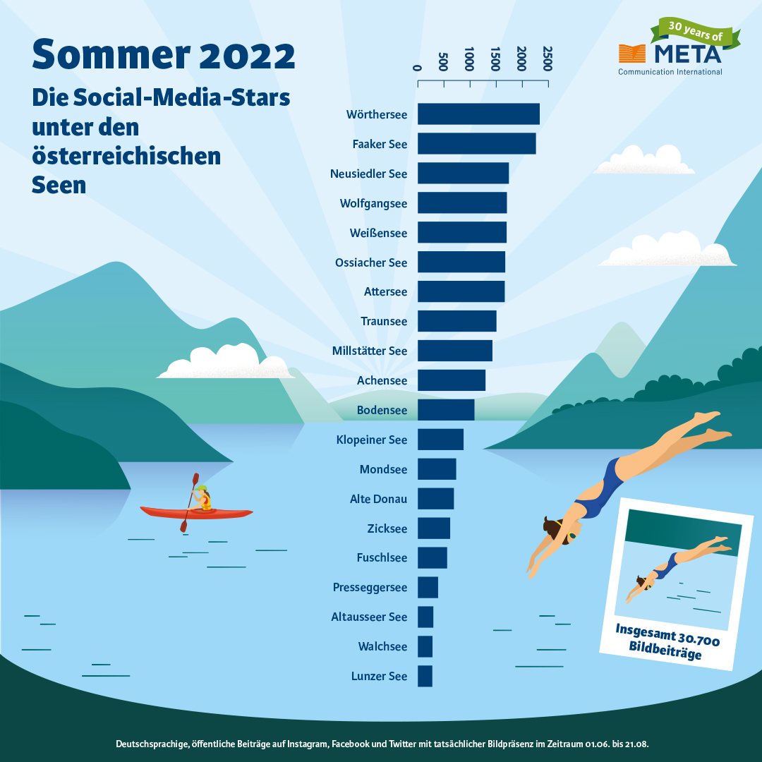 Zum Ende der Badesaison 2022 veröffentlicht META Communication, der Full-Service Anbieter für Medienbeobachtung und Medienanalyse, eine umfassende Analyse zur Bildpräsenz österreichischer Seen in den sozialen Medien. So wurden deutschsprachige Beiträge zu über 130 Gewässern in den Monaten Juni, Juli und August erfasst und genau unter die Lupe genommen. Es zeigt sich: Österreichs Seen bieten weit mehr als nur Abkühlung an heißen Tagen. Sie sind Erholungsort, Sportplatz, Kulturbühne, Arbeitsstätte, Lebensraum und noch vieles mehr.