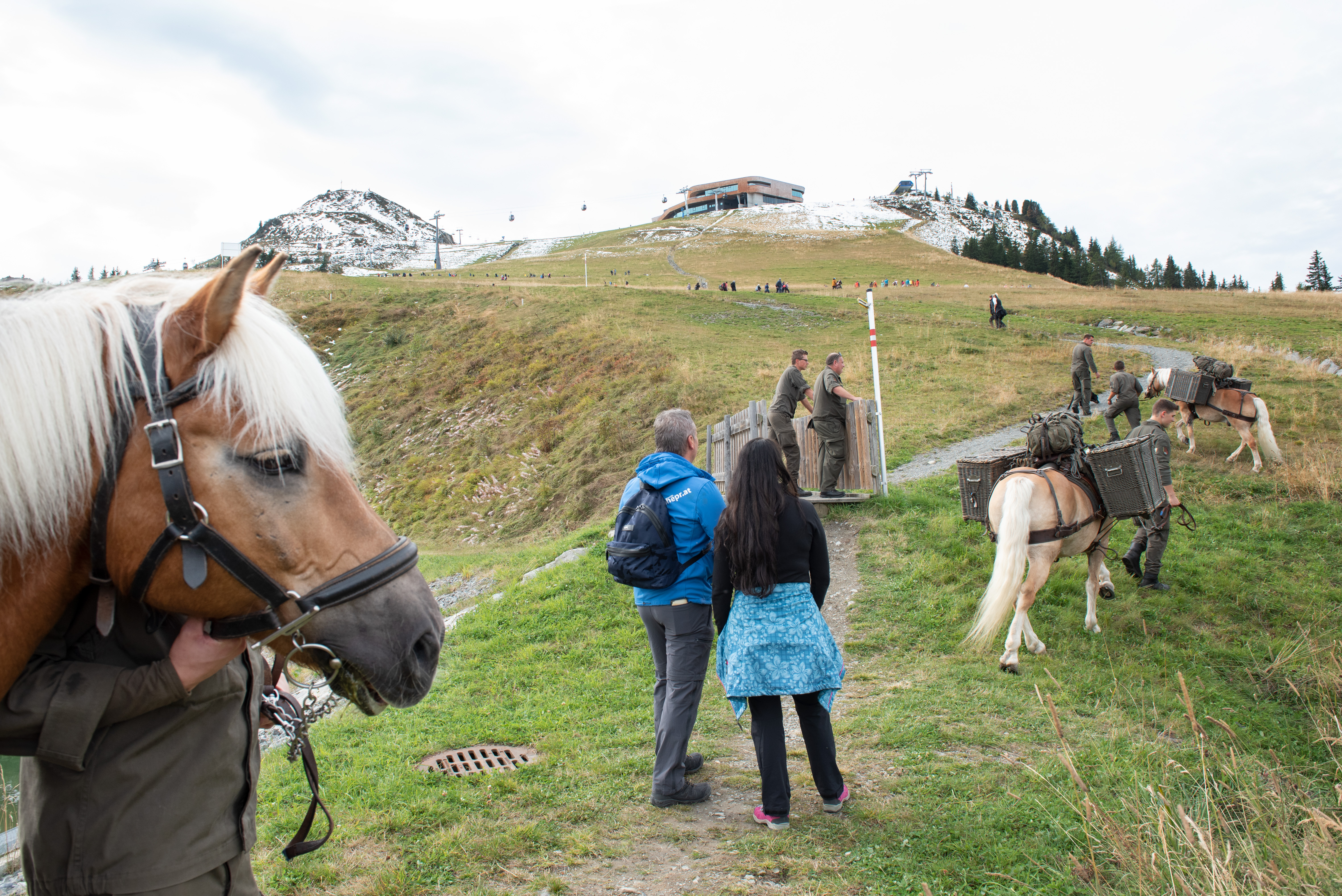 Am Samstag Morgen fanden sich die Teilnehmer bei der Talstation der Spieljochbahn ein. Nach einem stärkenden Kaffee vom café+co Barista-Team ging es mit der Gondel hoch auf 1.198 Meter. Dort nahm bereits die Tragtierstaffel des Österreichischen Bundesheeres Aufstellung. Gemeinsam mit mehreren Haflingern ging es dann von der Mittelstation der Spieljochbahn durch die malerische Berglandschaft des Zillertals auf den Berg hinauf. Snacks und Kaltgetränke wurden dabei mühelos von der trittsicheren Tragtierstaffel mitgenommen. Den Höhepunkt der Wanderung bildete die traditionelle Bergmesse, die von Hochwürden Pfarrer Erwin Gerst zelebriert wurde. Nach einem anschließenden Mittagessen im Bergrestaurant „Mountain Loft“ ging es nach der zwölften café+co Wirtschaftswanderung wieder zurück ins Tal.