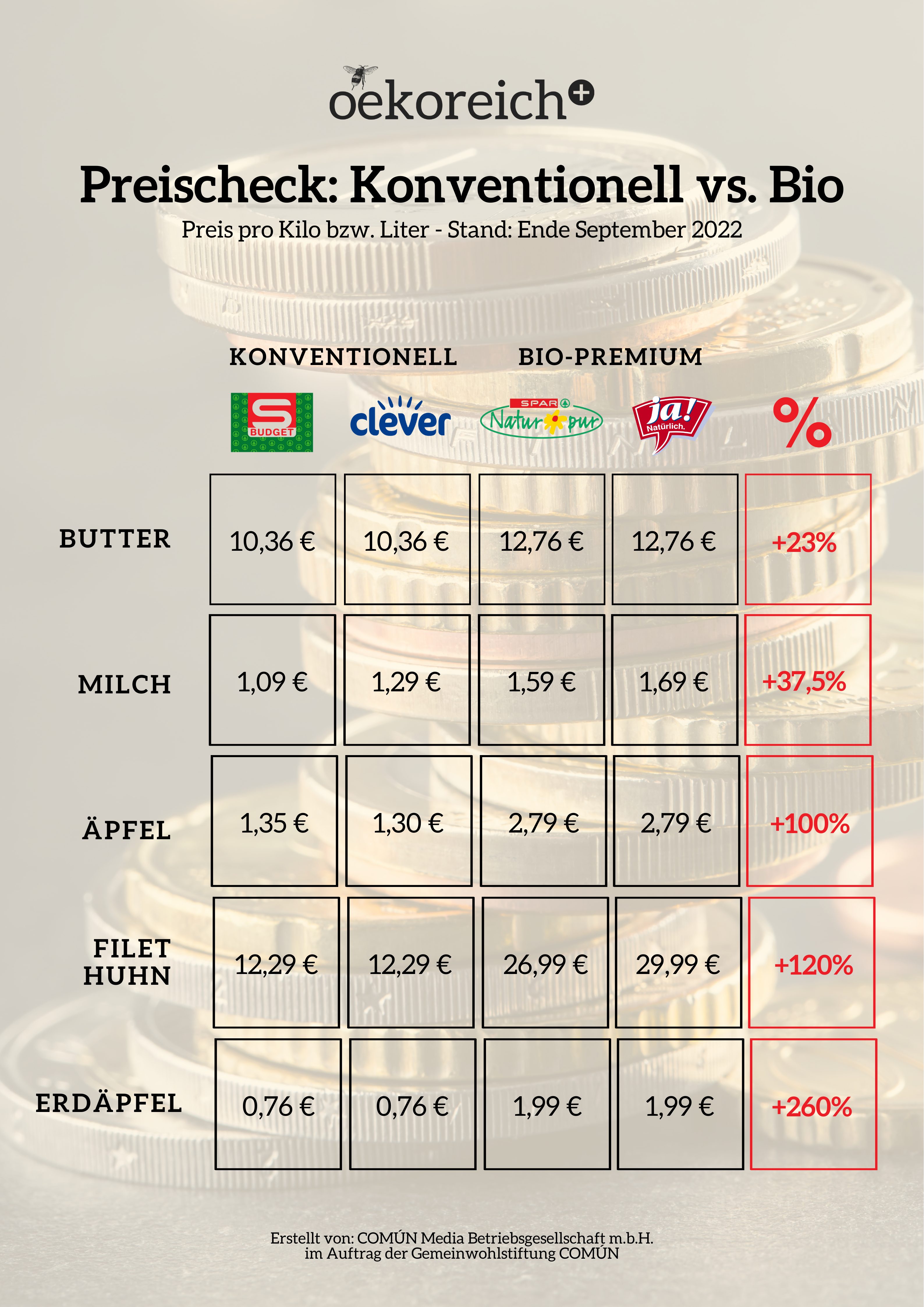 Mit Ende September wurden die Kosten für Butter, Milch, Äpfel, Hühnerfleisch und Erdäpfel bei den beiden größten Lebensmittelhändlern SPAR und BILLA gegenübergestellt. Dabei wurden die Preise der traditionell günstigsten Eigenmarken S-BUDGET bzw. CLEVER untereinander und mit den Bio-Premiummarken NATUR PUR bzw. JA! NATÜRLICH verglichen. Die Abweichungen zwischen konventionell und biologisch erzeugten Lebensmitteln fällt überraschend unterschiedlich aus.
