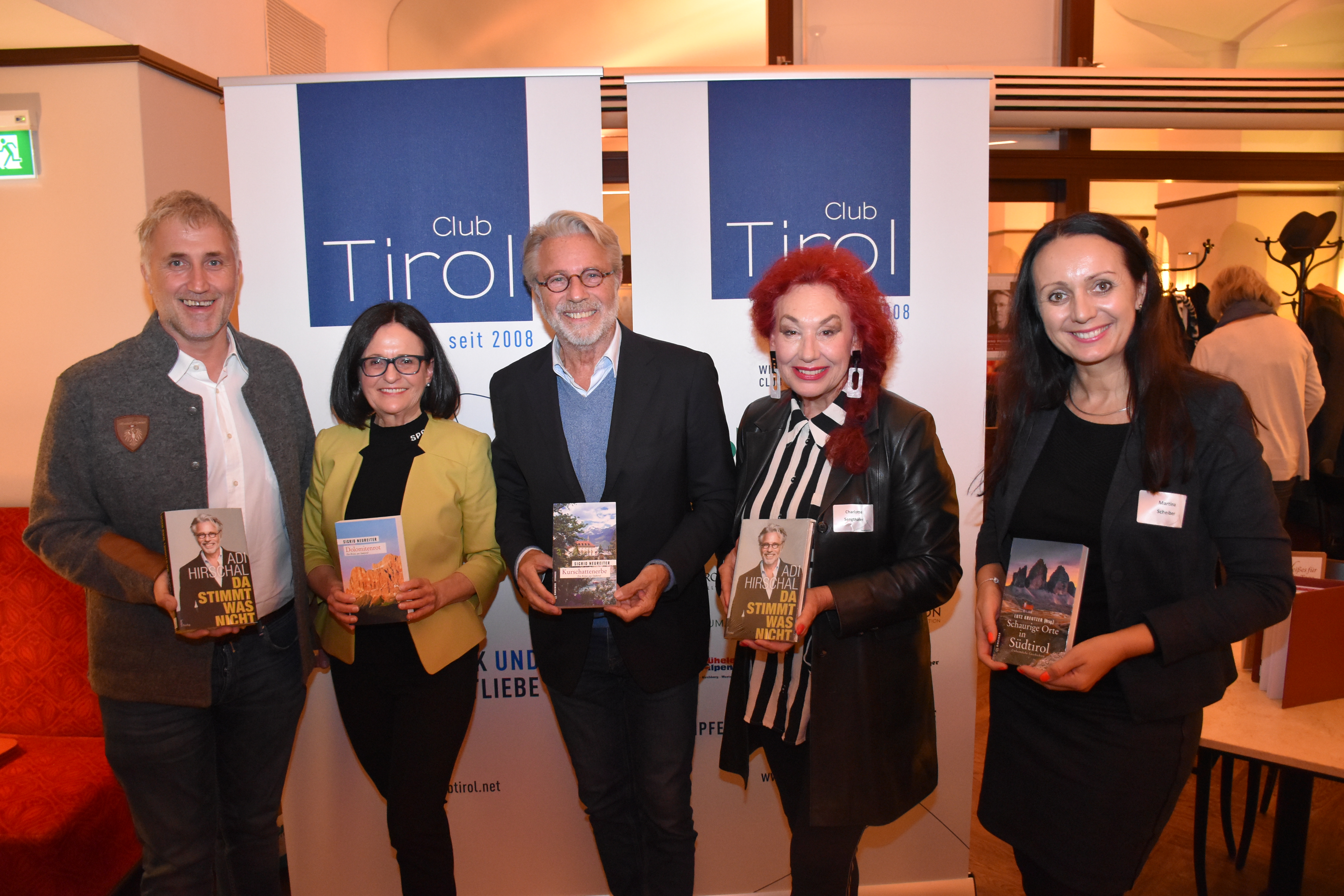 Club Tirol Vorstandsmitglied Charlotte Sengthaler präsentierte zum Start zwei Autoren mit Tiroler Wurzeln, deren Werke nicht unterschiedlicher sein können: Intendant, Schauspieler und Sänger Adi Hirschal erzählte aus seinem spannenden Leben vom Tiroler Kinderheim bis an die Seite prominenter Künstler und Stars, aus seiner Autobiographie „Da stimmt was nicht“. PR-Expertin und Autorin Sigrid Neureiter spannte den Bogen der Phantasie von ihren Südtirol-Krimis bis zum soeben erschienenen Sammelband „Schaurige Orte in Südtirol“.