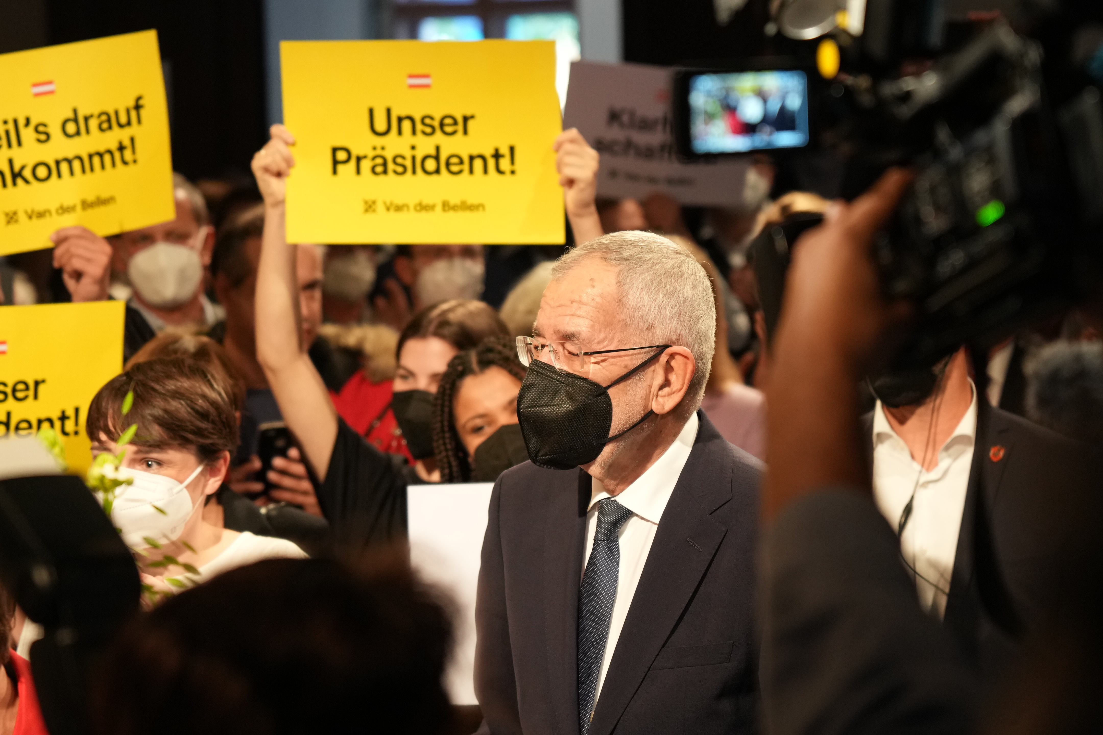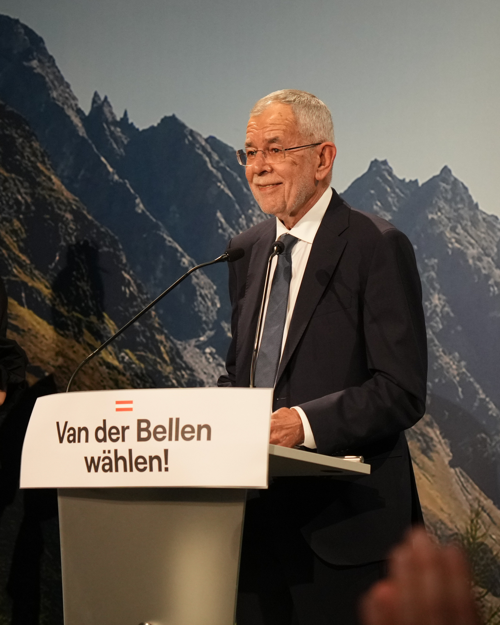 Der Kandidat und amtierende Bundespräsident Alexander Van der Bellen betonte in seiner Rede, dass es bei dieser Wahl nicht nur um ihn als Person ginge: „Es geht um Österreich.