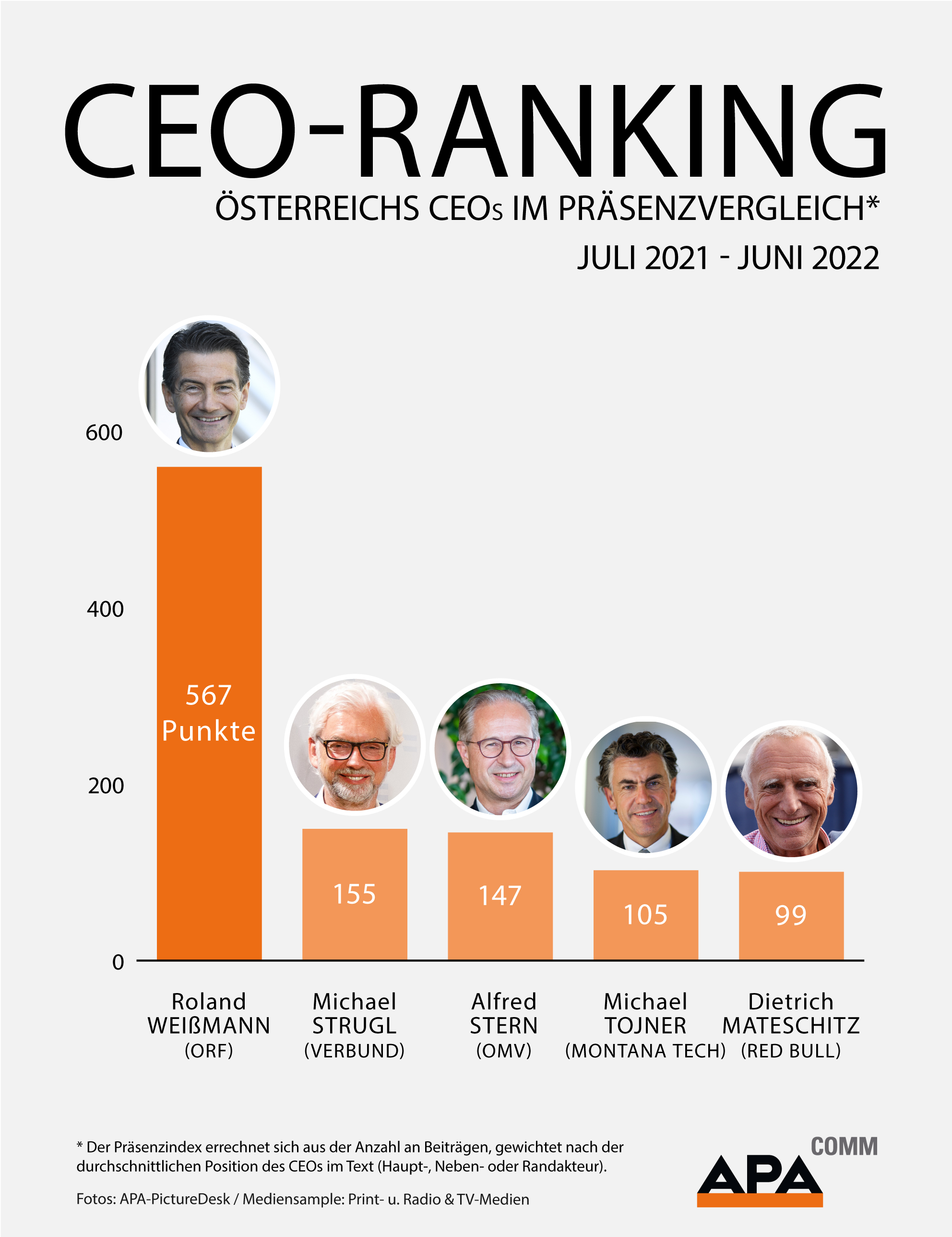 ORF-Generaldirektor Roland Weißmann ist der medial präsenteste Unternehmenslenker Österreichs. Das ergab das diesjährige APA-Comm CEO-Ranking, im Zuge dessen die Medienpräsenz von mehr als 220 heimischen Vorstandsvorsitzenden im Zeitraum Juli 2021 bis Juni 2022 analysiert wurden. Platz zwei belegt Verbund-CEO Michael Strugl (155 Punkte) knapp vor OMV-Chef Alfred Stern (147 Punkte). Im Vergleich zum Vorjahr befinden sich damit ausschließlich neue Akteure unter den drei medial sichtbarsten CEOs Österreichs. Montana-Tech-Vorstand Michael Tojner (105 Punkte) und Red-Bull-Chef Dietrich Mateschitz (99 Punkte) komplettieren die Top-5 der präsentesten Vorstandsvorsitzenden. Die bestgereihte Frau im Ranking ist AUA-Chefin Annette Mann auf Rang 15 (62 Punkte).