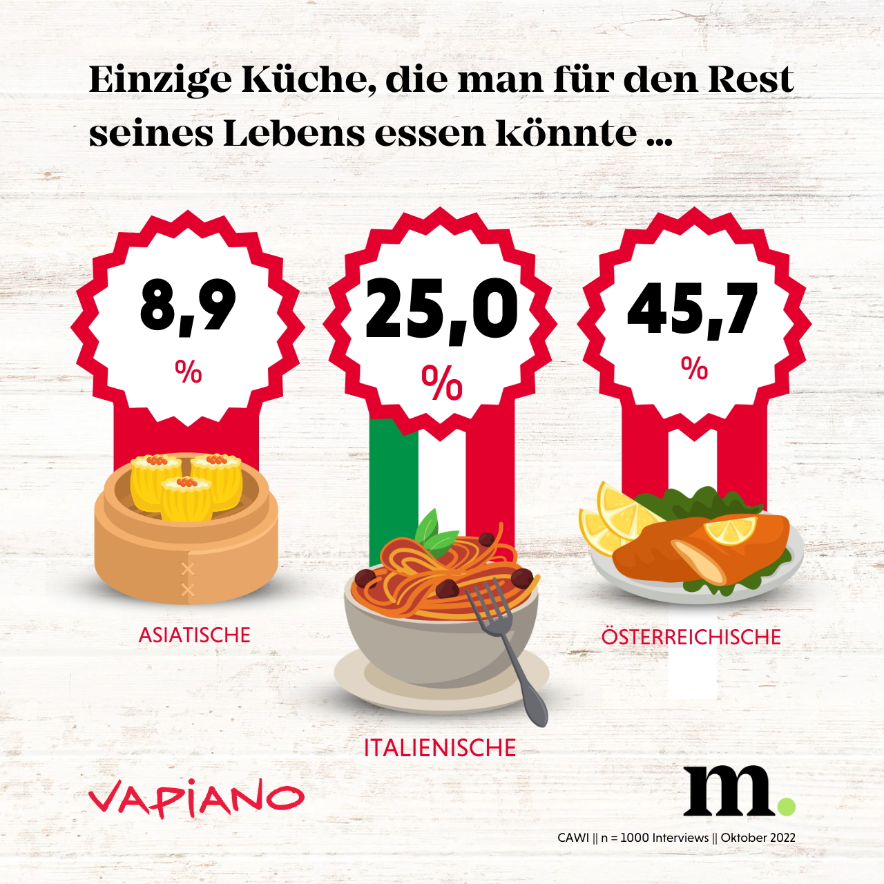 “, gibt Thomas Schwabl, Geschäftsführer von Marketagent, einen ersten Blick in die Umfrageergebnisse. Mit dem italienischen Lebensgefühl verbindet man hierzulande vor allem Genuss, Zeit mit der Familie und für die kleinen Freuden des Lebens. Auch kulinarisch liegt unser südliches Nachbarland hierzulande weit oben. Dürfte die heimische Bevölkerung nur noch eine einzige Küche für den Rest ihres Lebens essen, rangiert zwar die österreichische Küche an erster Stelle, ein Viertel würde sich jedoch für Essen dall'Italia entscheiden.