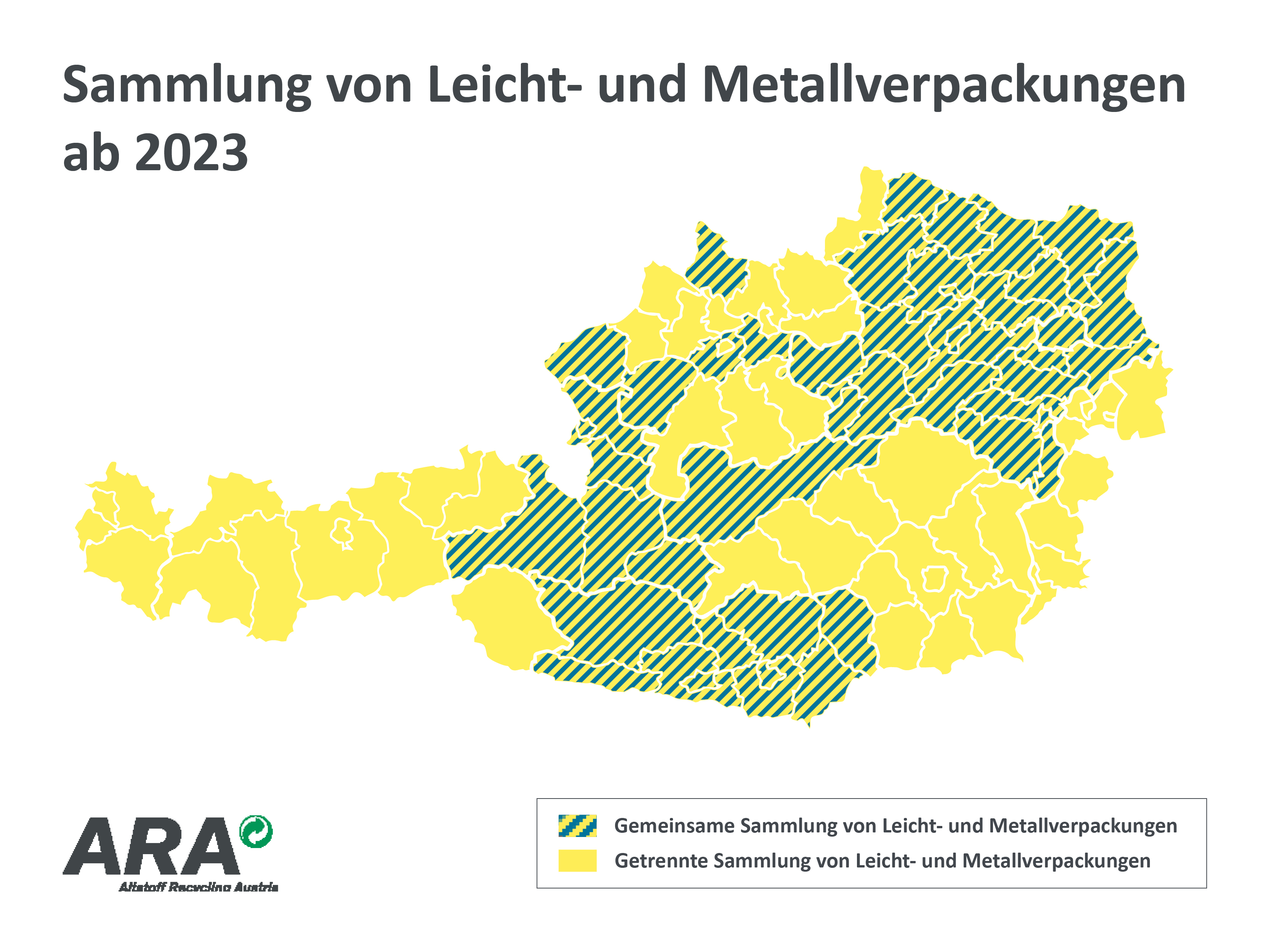 In Kärnten, Niederösterreich, Salzburg und Wien werden bereits ab 2023 alle Kunststoff- und Metallverpackungen in der Gelben Tonne und dem Gelben Sack gesammelt. In der Steiermark, Tirol, Vorarlberg und dem Burgenland kommt es 2023 zu keiner Änderung, hier werden Kunststoff- und Metallverpackungen wie bisher getrennt in der Gelben Tonne bzw. dem Gelben Sack und der Blauen Tonne gesammelt. Ab 2025 folgt auch hier die gemeinsame Erfassung. In Oberösterreich kommen regional unterschiedlich beide Sammelsysteme zum Einsatz. Änderungen gibt es in den Bezirken Braunau und Rohrbach, in denen die ARA mit 1. Jänner 2023 eine gemeinsame Sammlung von Kunststoff- und Metallverpackungen ab Haus einführt.