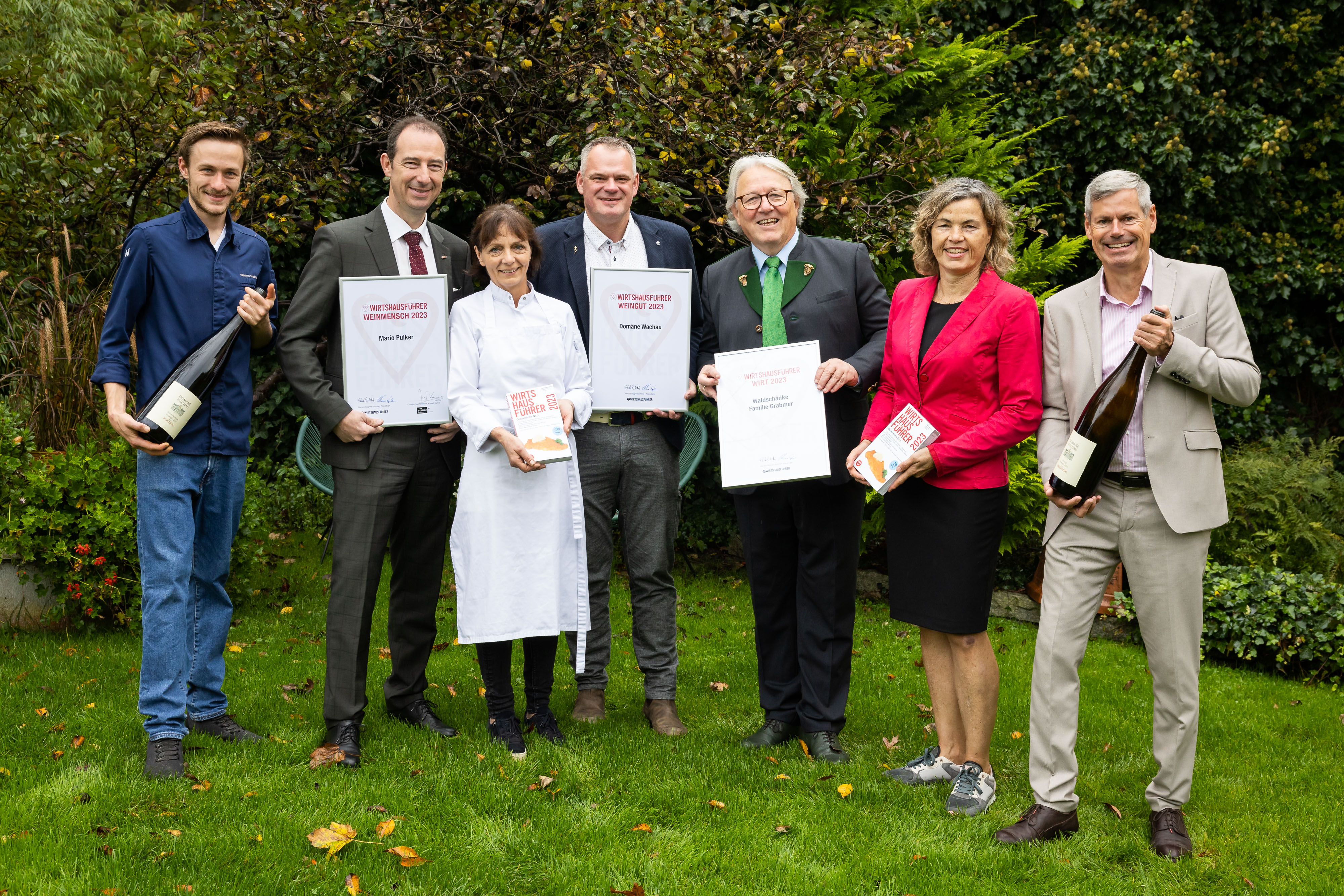 Foto von links: Die Ausgezeichneten des Wirtshausführers 2023: Junior- und Küchenchef Clemens Grabmer vom Wirtshausführer Wirt 2023, Waldschänke in Grieskirchen, Wirtshausführer Weinmensch 2023 Mario Pulker, Patronne und Küchenchefin Elisabeth Grabmer, Kellermeister Heinz Frischengruber vom Wirtshausführer Weingut 2023, Domäne Wachau, Patron Heinz Grabmer und die Wirtshausführer Herausgeber Elisabeth und Klaus Egle.