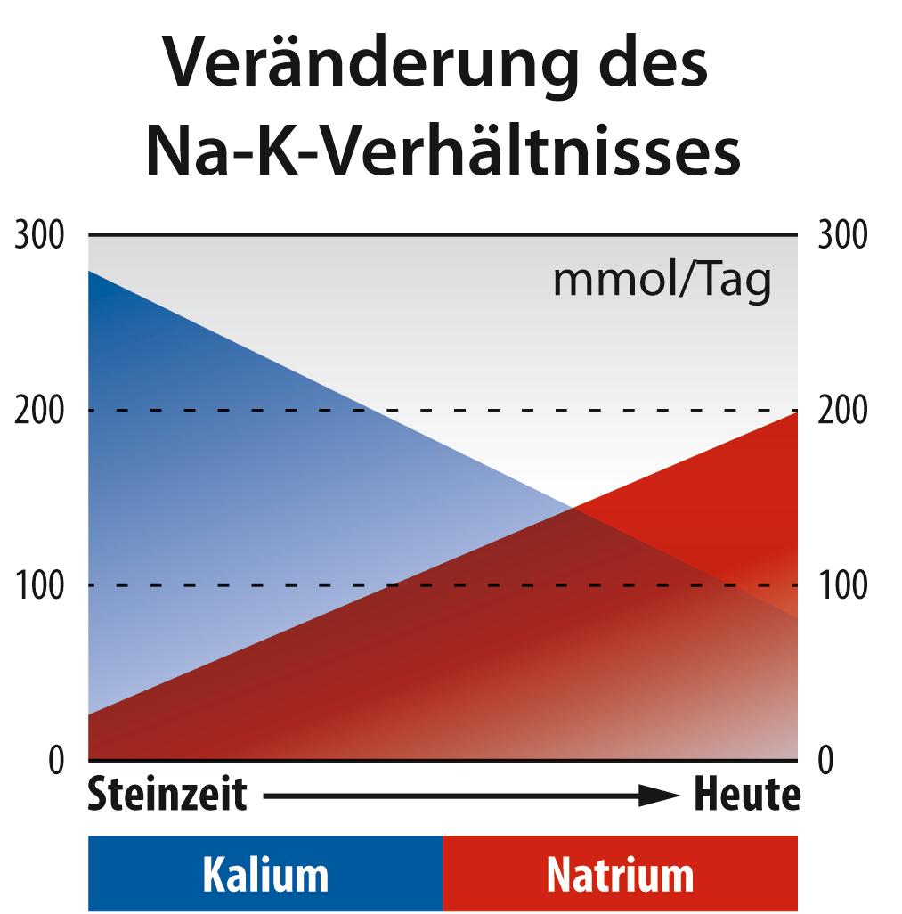 Mit der Industrialisierung hat sich die Mineralstoffzusammensetzung in unserer Ernährung stark verändert. Vor der Entwicklung der Landwirtschaft und noch heute bei Naturvölkern haben die Menschen täglich nur 0,8 g Natrium, aber 10,5 g Kalium zu sich genommen. Das Verhältnis von Kalium zu Natrium hat sich etwa um den Faktor 30 zum Natrium verschoben. Mit dem Natrium-Kaliumverhältnis hat sich analog das Säure-Basen-Verhältnis, insbesondere das Basen-Chlorid-Verhältnis stark zum säurebildenden Chlorid verschoben (Frassetto et al., 2001). Diese für uns artfremde Ernährungsweise hat ihren Preis: Der Mensch ist das einzige Säugetier mit einem tödlichen Hypertonie-Problem. Die ursprüngliche Ernährung des Menschen war reich an pflanzlicher Kost mit vielen organisch gebundenen basenbildenden Mineralstoffen, wie Kalium, Calcium und Magnesium. Heute besteht die Hauptenergiezufuhr aus verarbeiteten Nahrungsmitteln, wie z. B. Fleisch, Wurst und Käse, welche reich an säurebildenden Mineralstoffen in Form von Natriumchlorid (Kochsalz), Sulfat und Phosphat sind. Natriumchlorid, Sulfat, Phosphat und tierisches Protein führen bei dauerhaft hoher Zufuhr zu einer übermäßigen Säurelast. Eine säurebildende Ernährung erhöht insbesondere auch den Blutdruck. Dies ist schon bei Kindern und jungen Erwachsenen nachweisbar.