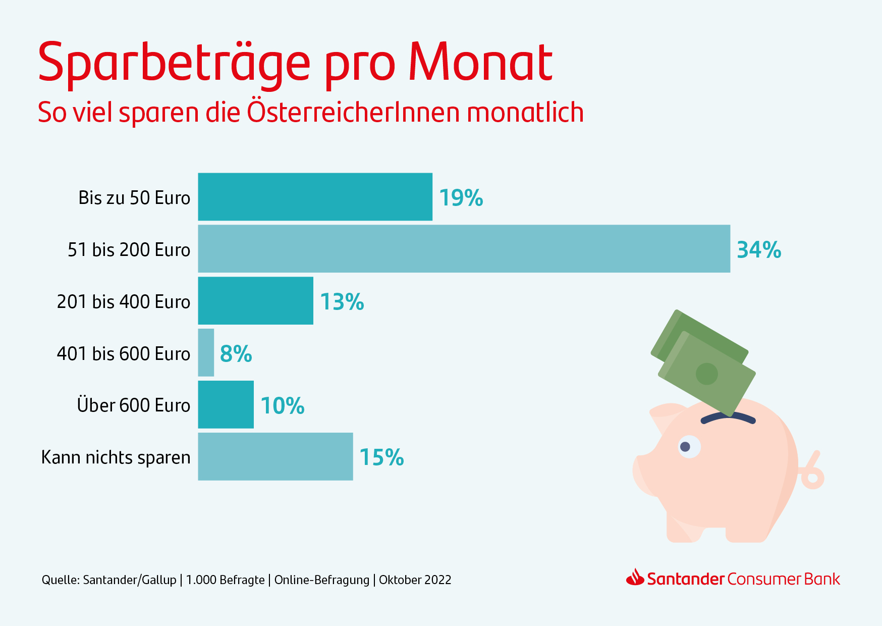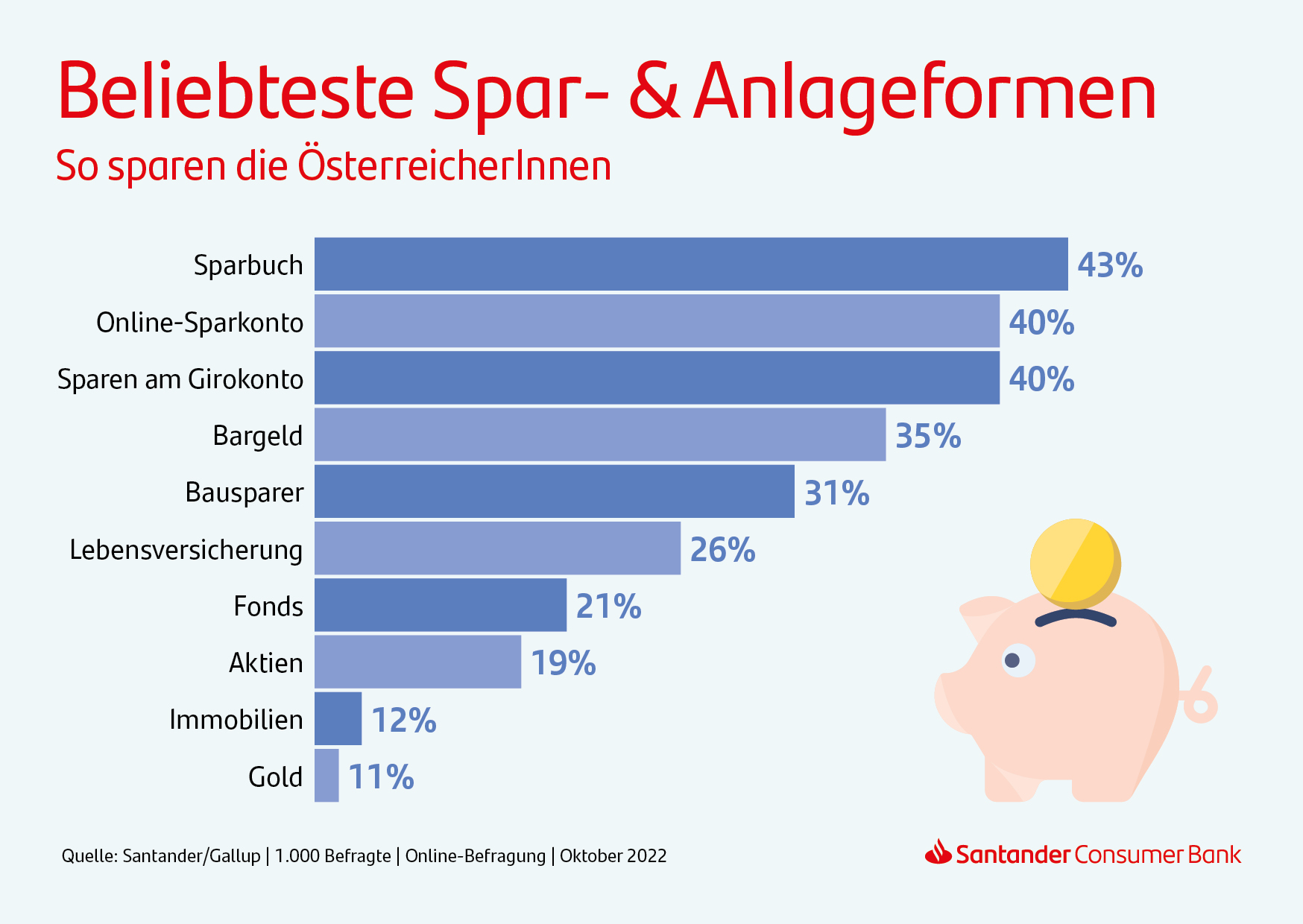 Das Marktforschungsinstitut Gallup befragte im Auftrag der Santander Consumer Bank 1.000 Personen in Österreich (max. Schwankungsbreite +/- 3,2 Prozent). Die Online-Befragung ist repräsentativ für die (Internet-affine) österreichische Bevölkerung ab 16 Jahren. Die Erhebung fand im Oktober 2022 statt.