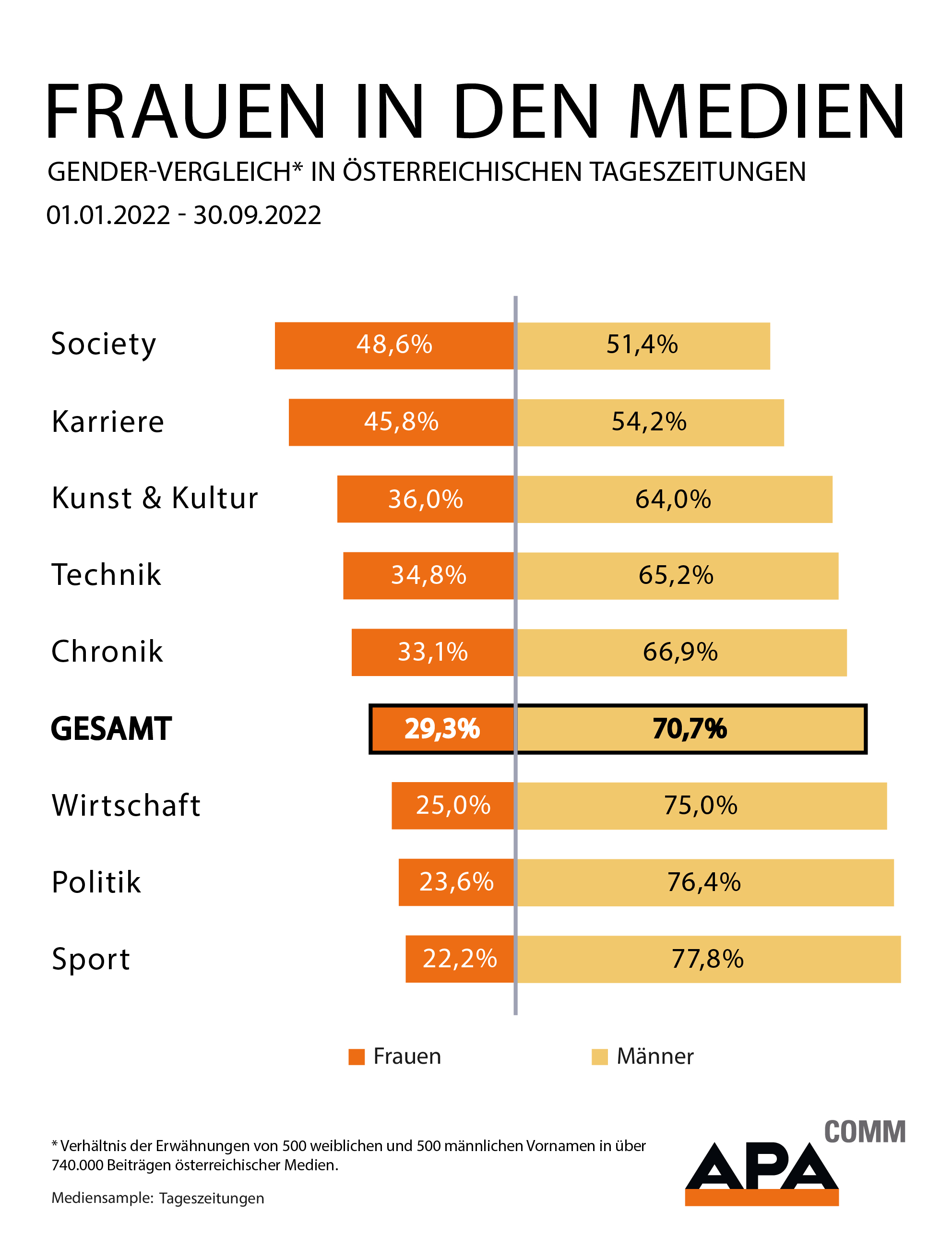 Aus einer Gesamtmenge von rund 740.000 Beiträgen erhoben die DatenanalystInnen, dass weibliche und männliche Vornamen im Verhältnis von 29,3 zu 70,7 Prozent stehen. Frauen werden in heimischen Medien somit weniger als halb so oft erwähnt wie Männer. Eine vergleichbare internationale Studie des Global Media Monitoring Project aus dem Jahr 2015 ergab ein ähnliches Geschlechterverhältnis (24 zu 76 Prozent).