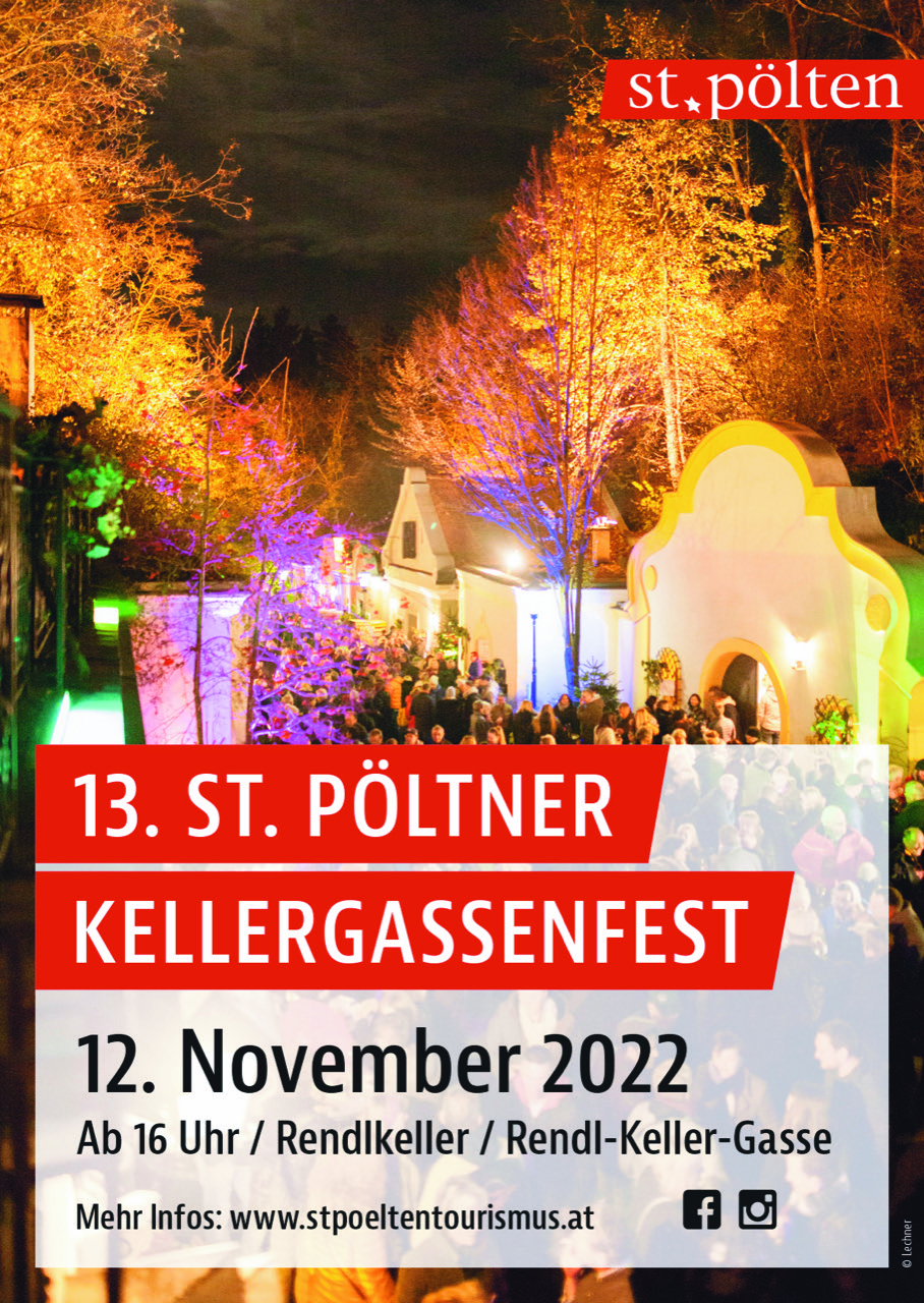 Das Kellergassenfest in St. Pölten ist einer der Höhepunkte im Eventkalender der Stadt und lockt gewöhnlich Tausende Personen in die malerische Rendl Keller-Gasse. Eröffnet und angestoßen wird um 16 Uhr gemeinsam mit den Veranstaltern, den Winzerinnen und Winzern und Bürgermeister Matthias Stadler. Der Eintritt ist frei (Gläsermiete wird eingehoben), es gibt Parkmöglichkeiten beim städtischen Wirtschaftshof sowie einen Parkplatzshuttle zum und ab dem Kellergassenfest.