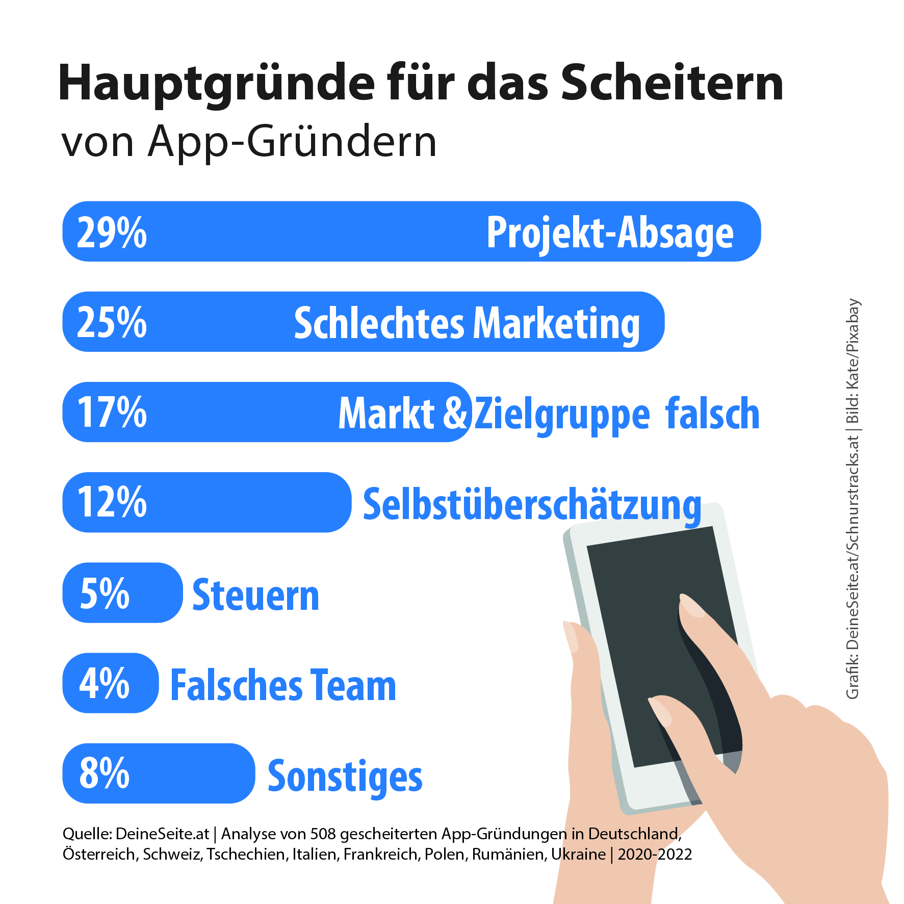 29% Projekt-Absage | 25% Schlechtes Marketing | 17% Markt & Zielgruppe falsch | 12% Selbstüberschätzung | 5% Steuern | 4% Falsches Team | 8% Sonstiges - Quelle: DeineSeite.at, Analyse von 508 gescheiterten App-Gründungen in Deutschland, Österreich, Schweiz, Tschechien, Italien, Frankreich, Polen, Rumänien, Ukraine (2020-2022)
