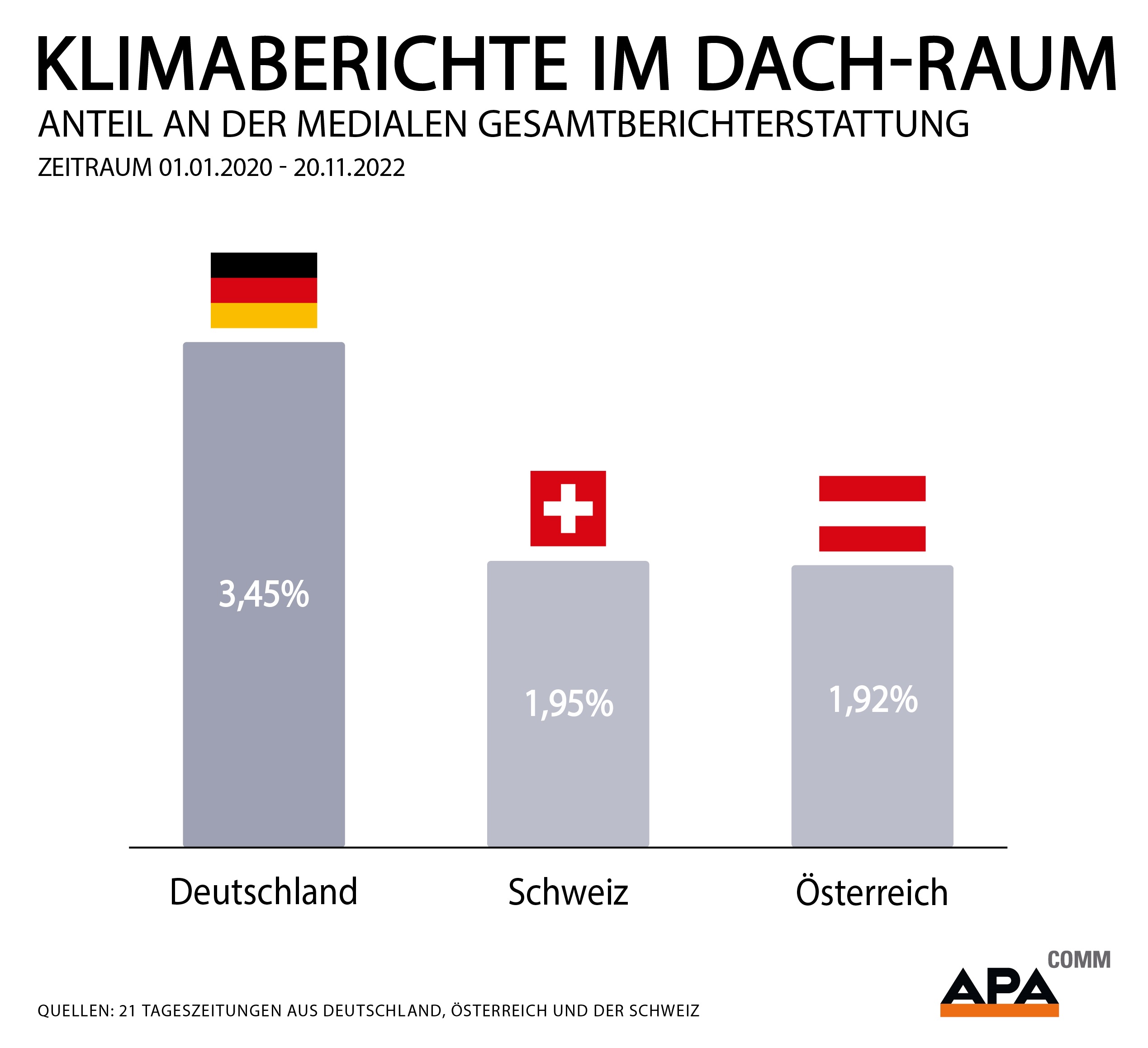 Die UN-Weltklimakonferenz stellt jeden Herbst traditionell den Höhepunkt der jährlichen Klimaberichterstattung dar. Anlässlich der kürzlich zu Ende gegangen COP 27 im ägyptischen Sharm el-Sheikh hat APA-Comm den medialen Klimadiskurs der letzten drei Jahre im Detail analysiert und deutsche, österreichische und Schweizer Medien miteinander verglichen. Die Ergebnisse dieser DACH-Analyse zeigen, dass der Anteil der Klimaberichte an der Gesamtberichterstattung in den untersuchten deutschen regionalen und überregionalen Tageszeitungen mit Abstand am größten ist (3,45 Prozent), jener in österreichischen (1,92 Prozent) und Schweizer Medien (1,95 Prozent) ist nahezu gleich. Darüber hinaus zeigt sich, dass die Klimaproteste in den letzten Monaten zu einer bestimmenden Größe im Diskurs herangewachsen sind – mit Ausnahme der Schweiz.