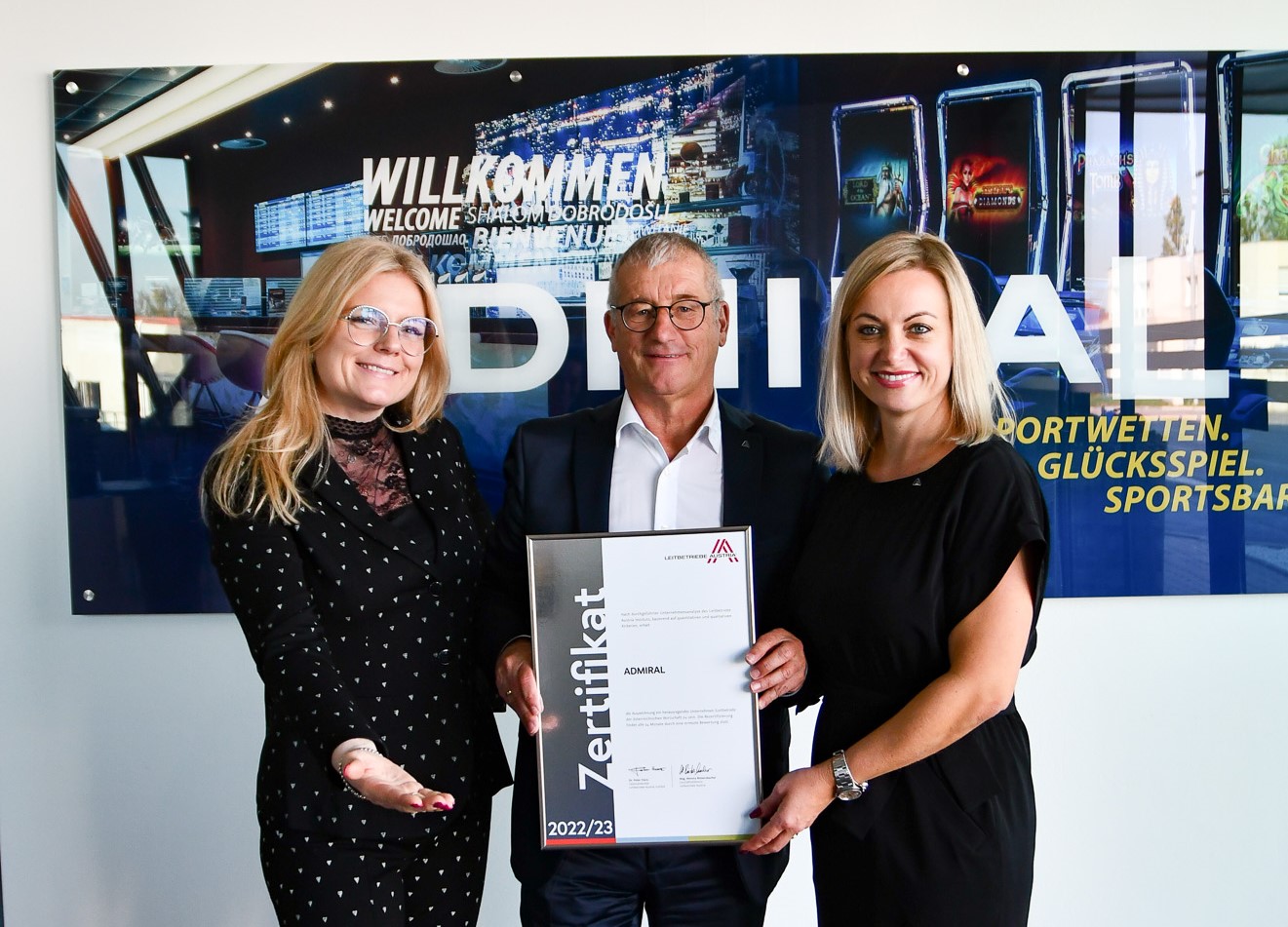 Darüber hinaus wurde ADMIRAL kürzlich durch „Leitbetriebe Austria“ der Status als österreichischer Leitbetrieb erneut bestätigt. Wesentlich für die Verleihung sind die gelebte soziale und ökologische Verantwortung, der nachhaltige Unternehmenserfolg, die Bedeutung für den Wirtschaftsstandort Österreich und die Bereitschaft zum Erfahrungsaustausch und zur Kooperation mit anderen Betrieben. „ADMIRAL investiert sehr viel Zeit und Geld, um ihre soziale Verantwortung wahrzunehmen. Das Unternehmen ist europaweit ein Benchmark im Bereich des Spielerschutzes“, erklärte Leitbetriebe Austria-Geschäftsführerin Monica Rintersbacher bei der Verleihung im ADMIRAL-Headquarter in Wiener Neudorf.