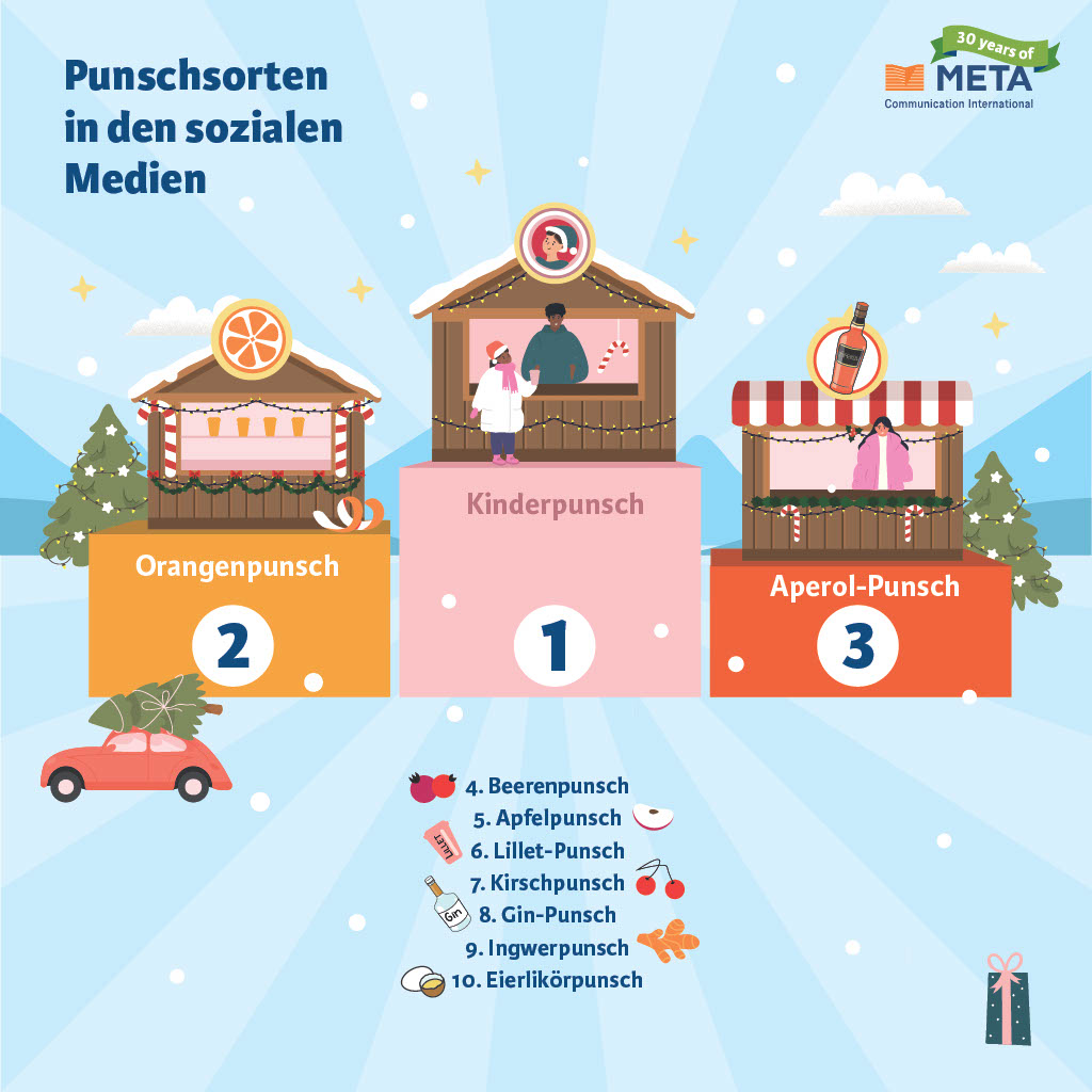 Kurz vor den Festtagen veröffentlicht META, der Full-Service Anbieter für Medienbeobachtung und Medienanalyse, eine Analyse zur Präsenz von Heißgetränken in den sozialen Medien. Nach zwei Jahren Corona-Pause bzw. eingeschränktem Betrieb starteten die Weihnachts- und Christkindlmärkte diese Saison wieder voll durch. Über 4.000 usergenerierte Beiträge zu allerlei erheiternden und wärmenden Getränken wurden öffentlich auf Instagram, Facebook, Twitter und TikTok geteilt.