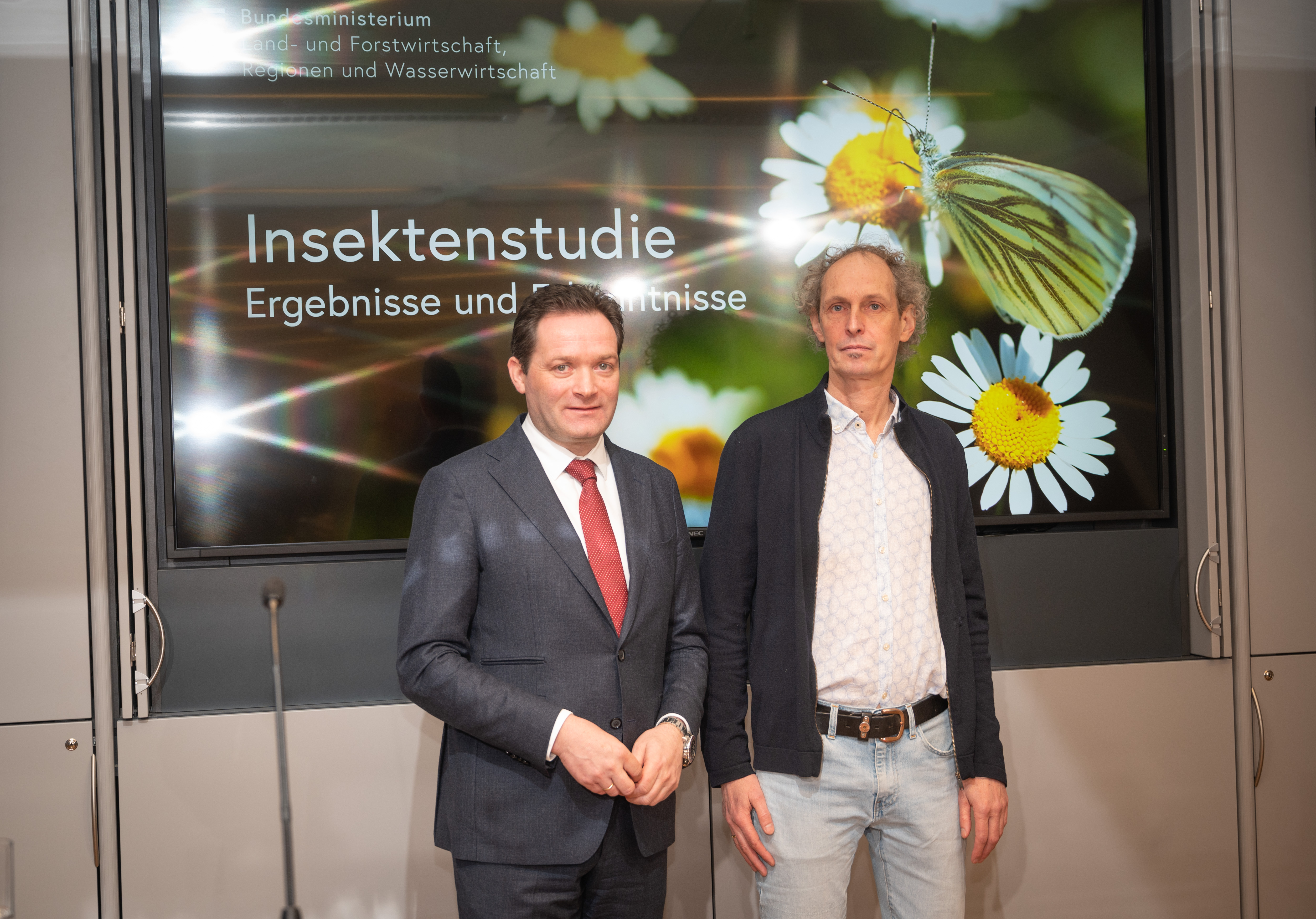 „Ohne Insekten keine Bestäubung. Ohne Bestäubung keine Lebensmittel. Wir alle wissen, was für eine zentrale Rolle Insekten für intakte Ökosysteme und das gesamte Leben auf der Erde spielen. Über den Insektenbestand in Österreich wird viel spekuliert. Um ein wissenschaftliche Einschätzung der Situation zu erhalten, hat mein Ministerium gemeinsam mit den Bundesländern eine Studie in Auftrag gegeben, um die Veränderungen der Insektenpopulationen in den letzten 30 Jahren zu analysieren. 22 Expertinnen und Experten haben daran mitgearbeitet. Das Ergebnis ist klar: Die Entwicklung der Insektenpopulationen in Österreich ist deutlich positiver als bisher angenommen.“, betont Landwirtschaftsminister Norbert Totschnig im Rahmen einer Pressekonferenz, wo er gemeinsam mit Insektenforscher Thomas Zuna-Kratky die Studienergebnisse vorstellte. Erhoben wurden Daten von 4.285 Insektenarten an 309 Testflächen in ganz Österreich. So wurden Veränderungen von Insektenpopulationen in den letzten 30 Jahren analysiert - etwa von Heuschrecken, Fangschrecken, Hummeln Wanzen oder Zikaden. „Das ist die umfangreichste Erhebung zur Entwicklung der Insektenpopulation, die es in Österreich je gegeben hat“, hält Totschnig fest.