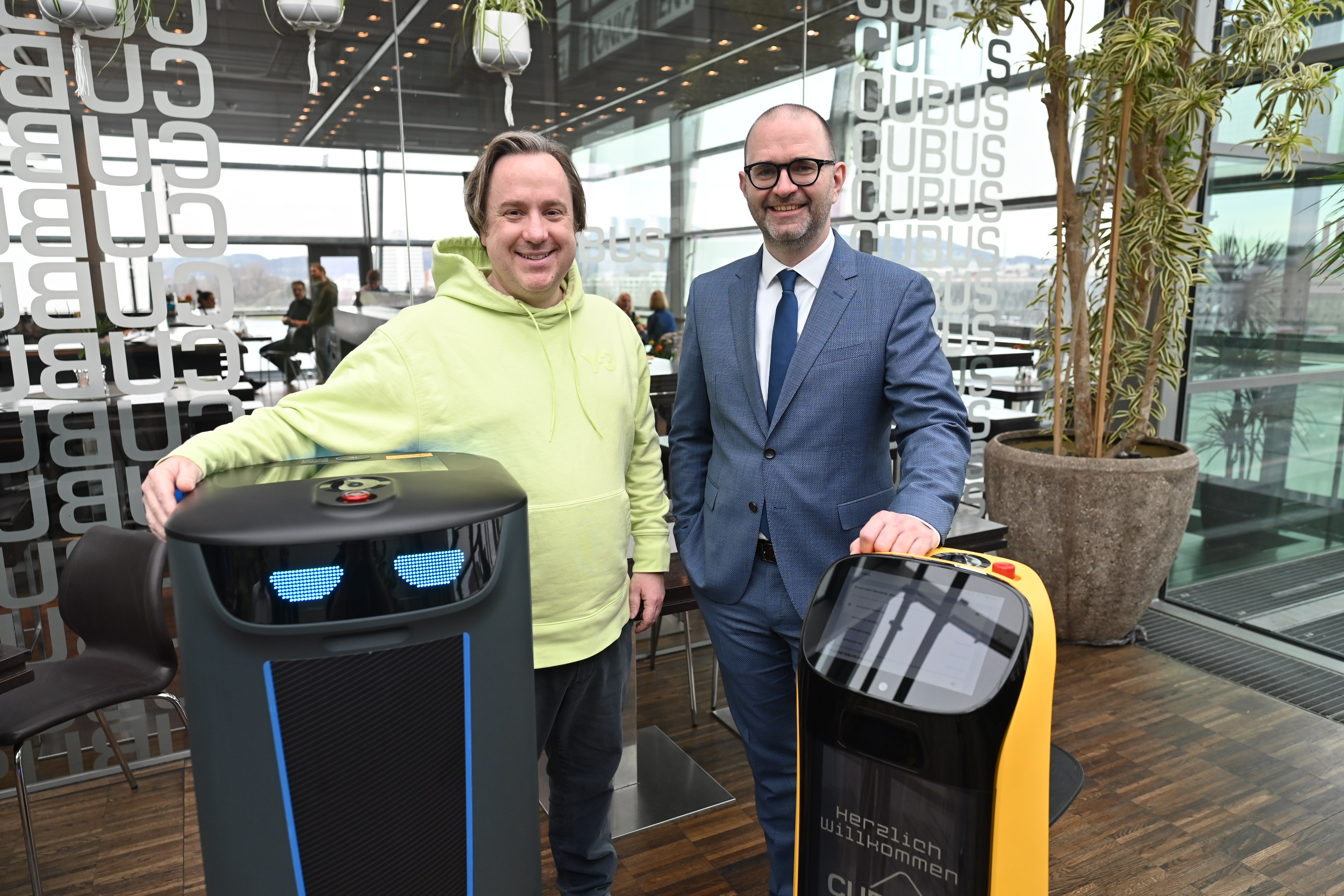 Als besonderes Special, um die Mensch-Roboter-Thematik des AEC mit dem CUBUS zu verknüpfen, werden im neuen CUBUS-Bistro von Beginn an zwei Servierroboter des Robotik- und Automatisierungsspezialisten Schmachtl erstmals zum Einsatz kommen. „Wir wollen das Museumserlebnis auch in der Gastronomie erlebbar machen und arbeiten hier mit international führenden Partnern zusammen. Wir sind glücklich mit den Robotern von Beginn an quasi ein transhumanistisches Bistro-Erlebnis umsetzen zu können“, so Kaufmann. Zum Einsatz kommen der „Kettybot“ und der „Holabot“, die das Service unterstützen sollen und ein besonderes Erlebnis für die Gäste bieten. „Mit mehr als 80 Jahren Erfahrung im Industriesektor hat es sich das Unternehmen Schmachtl zur Aufgabe gemacht, das Leben der Mitarbeiter in der Gastronomie einfacher und effizienter zu gestalten. Daher freut es uns ganz besonders, dass das CUBUS im AEC, wo ja seit jeher genau die Schnittstelle zwischen Mensch und Robotik auf unterschiedlichste, innovative Art und Weise untersucht und präsentiert wird, auf unsere Serviceroboter zurückgreift“, sagt Daniel Zehetner, Verkaufsleiter für den Bereich Servicerobotik von Schmachtl, mit Sitz in Linz.