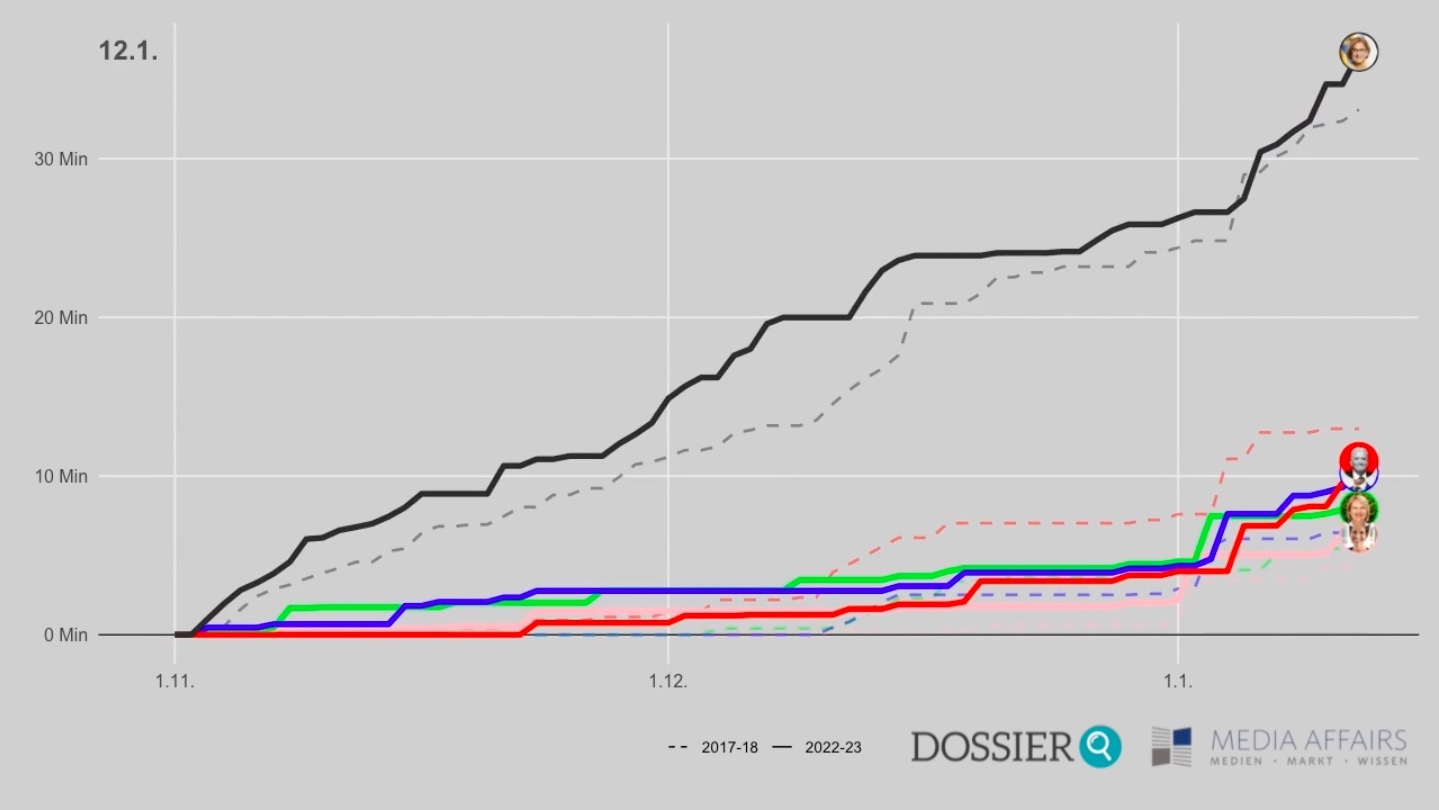Zum Vergleich: Die Kandidat·innen der anderen Parteien – Franz Schnabl (SPÖ), Udo Landbauer (FPÖ), Helga Krismer (Grüne) und Indra Collini (Neos) – erreichen gemeinsam 35 Minuten und 21 Sekunden Präsenzzeit in der wohl wichtigsten TV-Nachrichtensendung des Bundeslands, im ORF-Format „Niederösterreich heute“.