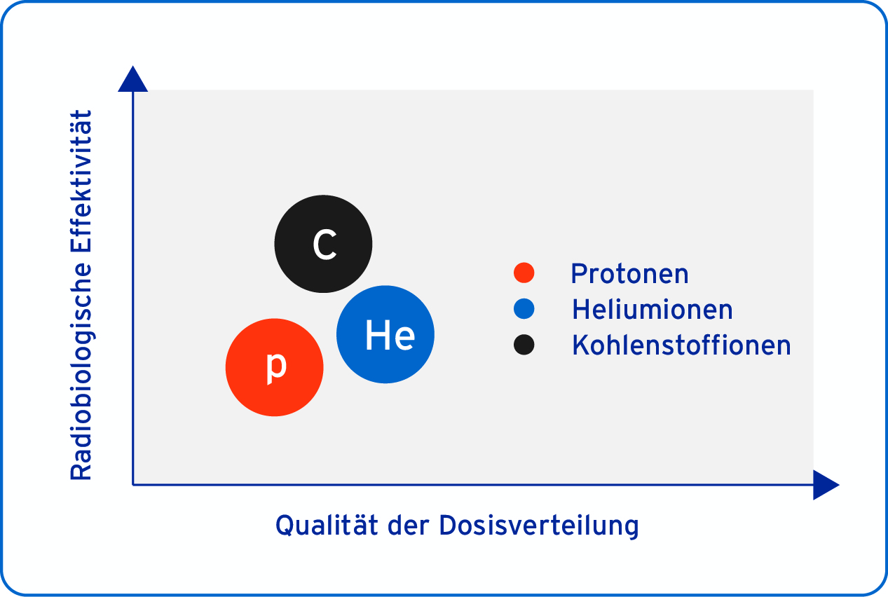 Die Grafik zeigt sowohl die Qualität der Dosisverteilung als auch die radiobiologische Effektivität (RBE) der Partikel im Vergleich: je höher die radiobiologische Effektivität der Partikel ist, umso höher ist auch die Wahrscheinlichkeit für die Zerstörung der Tumorzellen. Je besser sich die Qualität der Dosisverteilung gestaltet, umso besser kann gesundes Gewebe geschont werden.