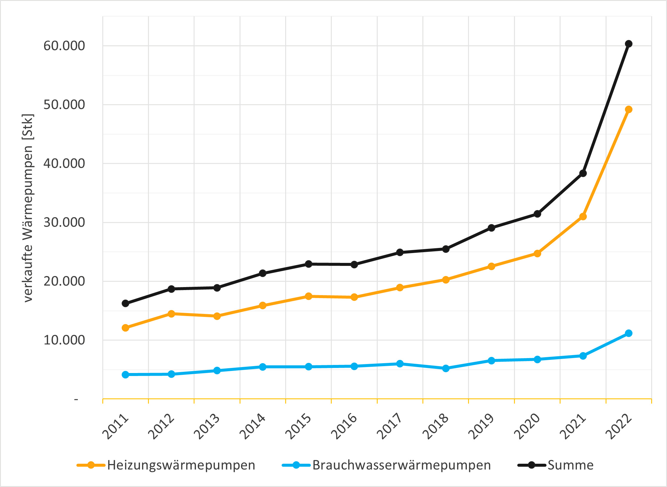 Mit 61.546 Stück verkauften Wärmepumpen wurde im österreichischen Inlandsmarkt im Jahr 2022 wieder ein neuer Rekordabsatz erreicht. Davon entfallen 50.393 auf Heizungs-Wärmepumpen und 11.153 auf Brauchwasser-Wärmepumpen. Diese beeindruckende Zahl bedeutet ein Fortschreiten des Trends, der über die letzten Jahre immer deutlicher zu sehen war. Die Wärmepumpe ist das führende Heizsystem im Neubau, mit starkem Wachstum in der Sanierung.