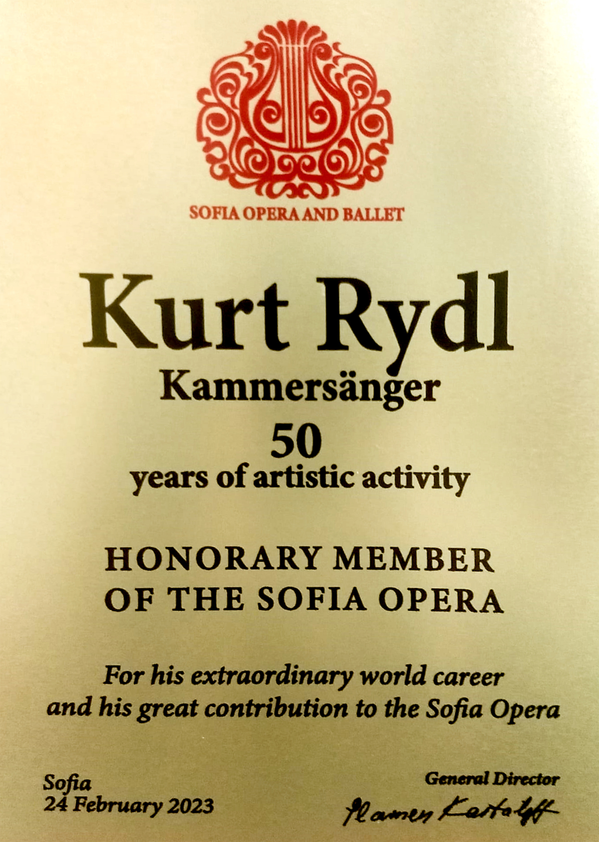 Mit einer feierlichen Zeremonie am 24. Februar 2023 erhob der Generaldirektor des bulgarischen Opernhauses in Sofia, Plamen Kartaloff, den international renommierten, österreichischen Kammersänger Kurt Rydl zum Ehrenmitglied der Oper Sofia. Damit ehrte Kartaloff die außergewöhnliche Weltkarriere des Künstlers Kurt Rydl und dessen großes Engagement für das Opernhaus Sofia.
