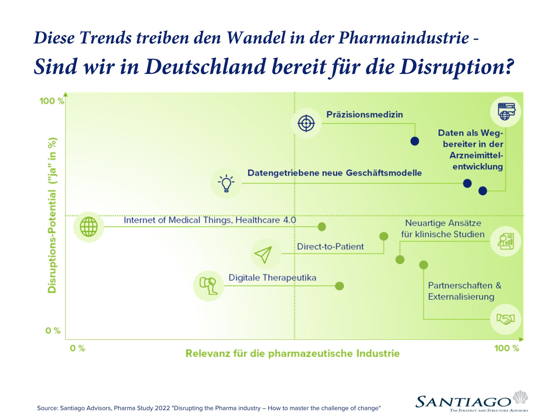 Die Studie mit dem Titel "Disrupting the Pharma Industry - How to Master the Challenge of Change", wurde 2022 gemeinsam von Santiago Advisors und dem langjährigen AbbVie-Manager Dr. Stefan Simianer durchgeführt. Interessierte Unternehmen, Branchenvertretende, Journalistinnen und Journalisten sind herzlich eingeladen, sich mit uns in Verbindung zu setzen, um weitere Informationen zur Studie zu erhalten und sich auf die Herausforderungen der Zukunft vorzubereiten.