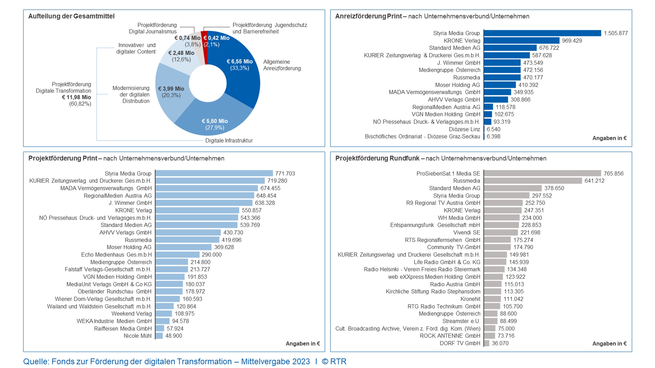 Weitere Grafiken zur Mittelvergabe aus dem Fonds zur Förderung der digitalen Transformation 2023 stehen auf der Website der RTR zum Download zur Verfügung: