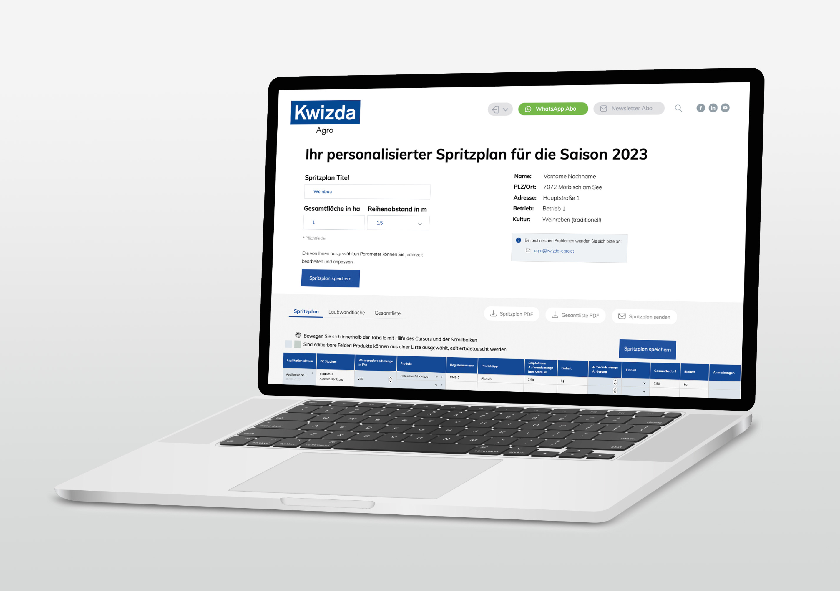 Der digitale Spritzplan-Konfigurator von Kwizda Agro ist eine Desktop-Anwendung, die einen Spritzplan erstellt, der regional angepasst ist. Die Datenbank im Hintergrund ist mit allen relevanten regionalen Merkmalen befüllt, die über die Eingabe der entsprechenden Postleitzahl ermittelt werden. Anhand weniger Angaben werden so die passenden Produkte für die unterschiedlichen Wachstumsphasen und in den richtigen Dosierungen vorgeschlagen – und das sowohl im biologischen als auch im konventionellen Bereich. Alle gewählten Produkte werden durch Angabe der Hektargröße automatisch in der richtigen Menge in die Einkaufsliste inkl. der verfügbaren Gebindegrößen übernommen. Der vollständige Plan für ein ganzes Jahr ist somit einfach und rasch erstellt. Er wird zudem gespeichert und kann laufend an veränderte Bedingungen angepasst werden. So verbindet der digitale Spritzplan- Konfigurator optimal das Wissen von Kwizda Agro mit der Erfahrung der Weinbauern.