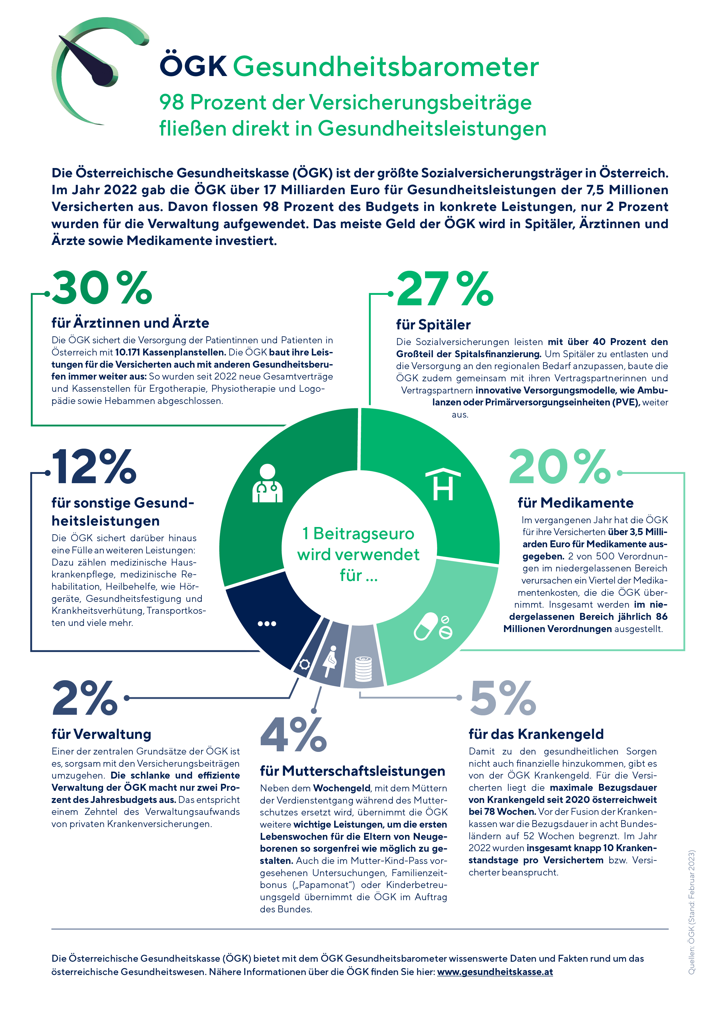 Die Österreichische Gesundheitskasse (ÖGK) ist der größte Sozialversicherungsträger in Österreich und verwaltete 2022 Beiträge in Höhe von 17 Milliarden Euro für ihre 7,5 Millionen Versicherten. 98 Prozent der Versichertenbeiträge fließen direkt in Gesundheitsleistungen. Das meiste Geld der ÖGK wird für ärztliche Versorgung, Spitäler sowie Medikamente ausgegeben.