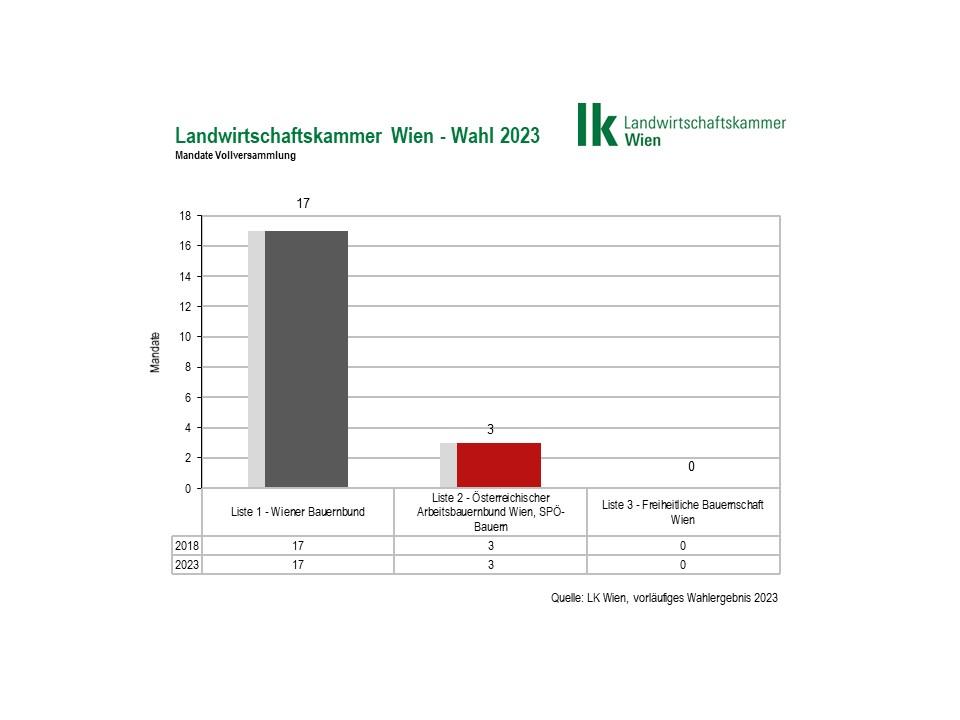 Die Mandatsverteilung in der Kammer-Vollversammlung für die Funktionsperiode 2023-2028 bleibt unverändert und sieht wie folgt aus: 17 Mandate Wiener Bauerbund und 3 Mandate SPÖ Bauern. Die Freiheitliche Bauernschaft Wien (FPÖ) schaffte den Einzug in die Vollversammlung nicht. Gemäß dem Wiener Landwirtschaftskammer-Gesetz entsendet die Stadtregierung zudem 3 kooptierte Kammerräte, analog den Kräfteverhältnissen in der Stadtregierung in die Vollversammlung der LK Wien.
