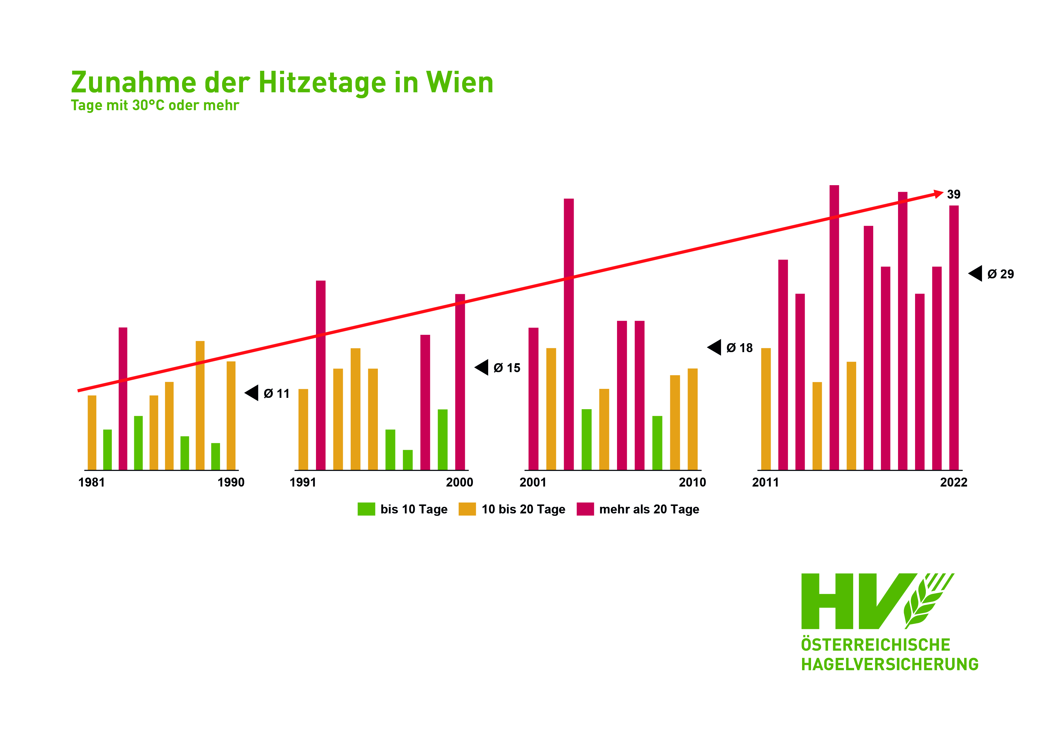 Österreichische Hagelversicherung (20. März 2023): „Der heute erscheinende IPCC-Synthesebericht zeigt sehr deutlich: Die Klimakrise ist nichts Abstraktes, auch nicht in Österreich. Im Gegenteil: Die Erderwärmung ist im vollen Gange“, erklärt der Vorstandsvorsitzende der Österreichischen Hagelversicherung, Dr. Kurt Weinberger, und belegt den Klimawandel mit Zahlen: „Während wir beispielsweise in Wien in den 80er, 90er Jahren jährlich noch ca. 10 Hitzetage, also Tage mit mehr als 30 °C hatten, sind es jetzt knapp 30 Hitzetage pro Jahr, also das Dreifache.“ Spürbar ist die Erderwärmung aber auch an den zunehmenden Wetterextremen, die die Landwirtschaft mit der Werkstatt unter freiem Himmel unmittelbar und als erstes treffen. Sie nehmen an Häufigkeit und Intensität zu: Hagel, Sturm, Überschwemmung, Frost und vor allem die Trockenheit – diese Wetterrisiken schweben wie ein Damoklesschwert jährlich über der Landwirtschaft und führen zu massiven Ernteausfällen.