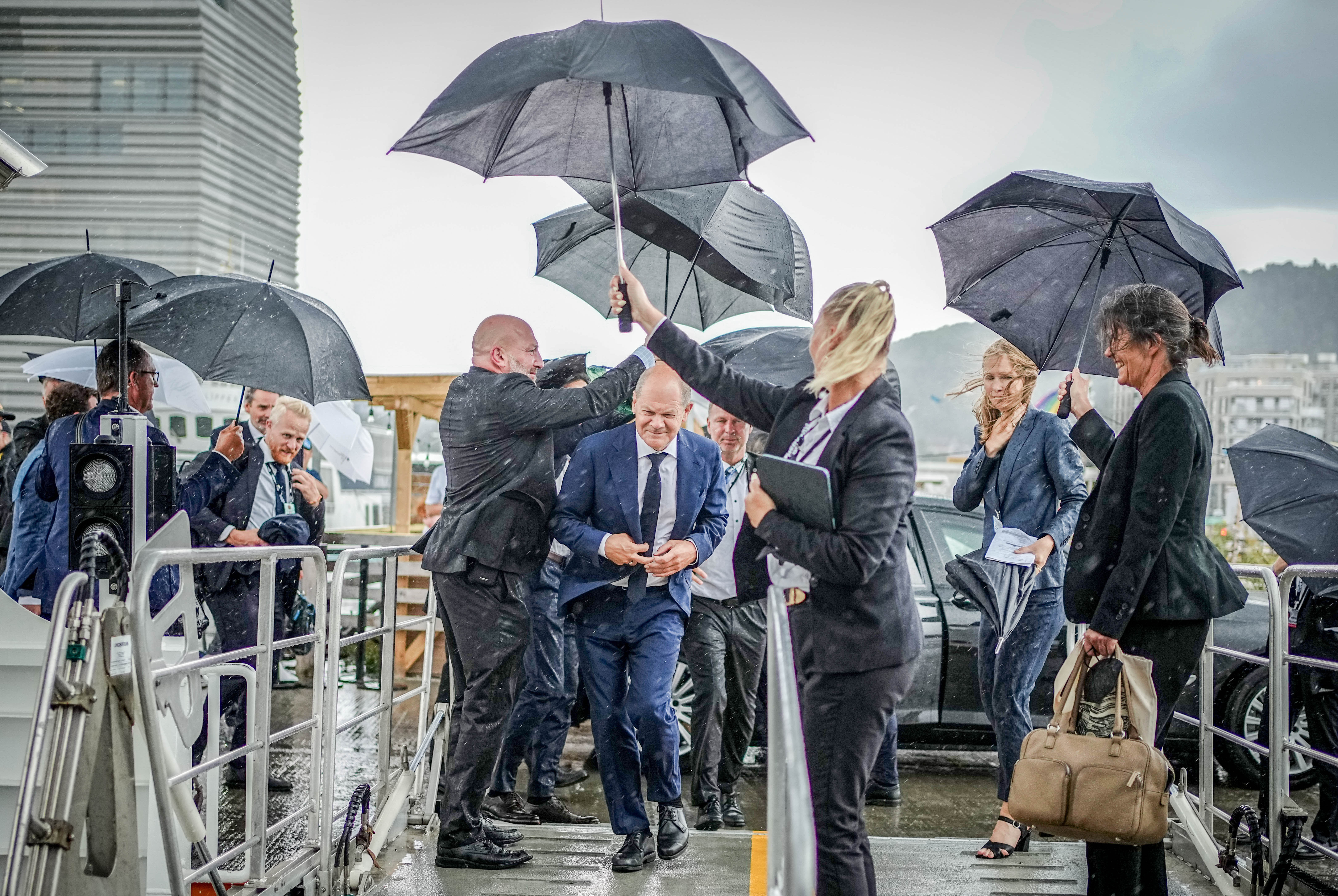 Bundeskanzler Olaf Scholz (SPD) im Regen auf dem Weg zu einem Gespräch mit dem norwegischen Ministerpräsidenten in Oslo auf einem Elektroschiff. (15.8.2022)