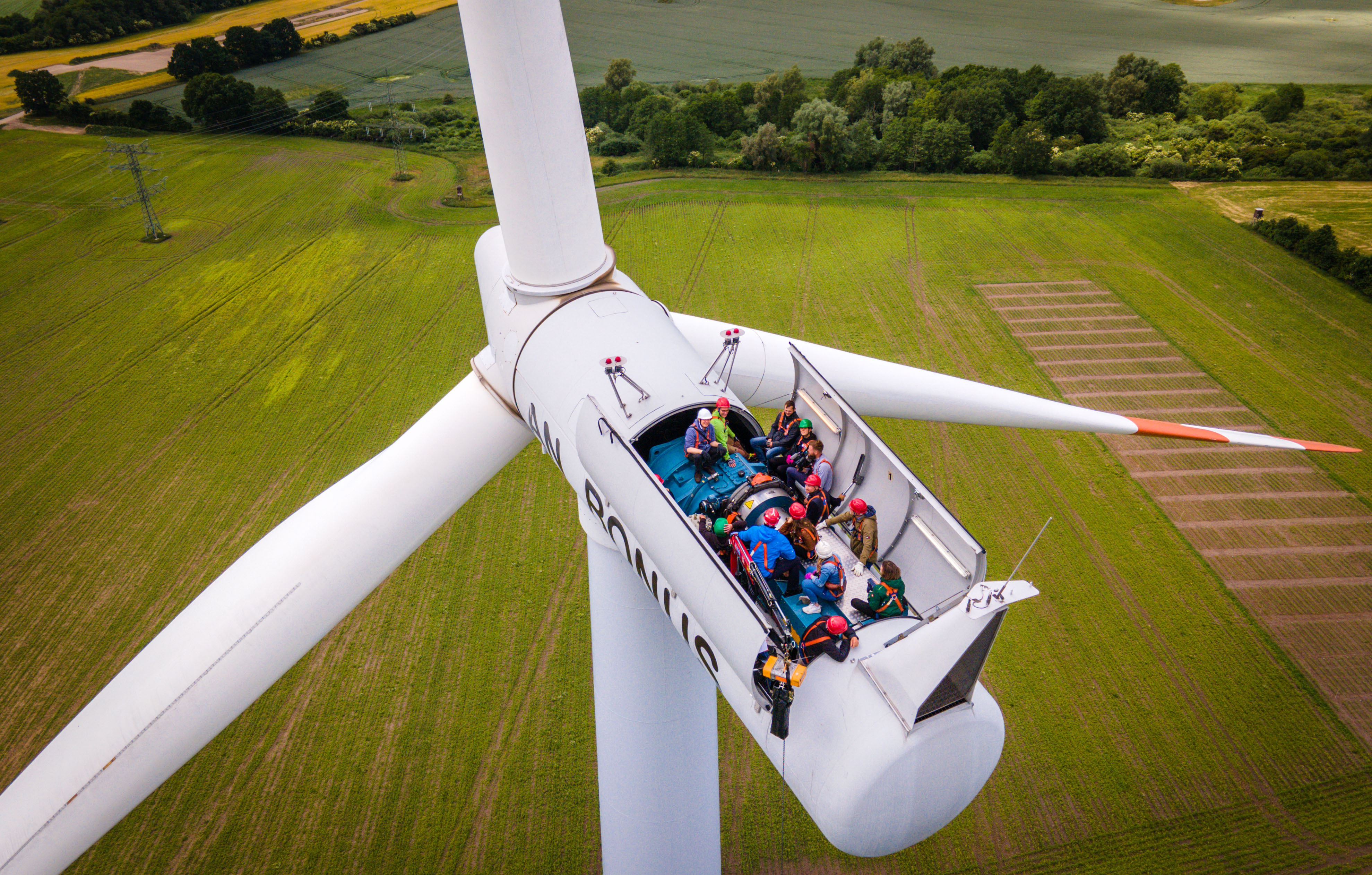 Lokalpolitiker und interessierte Bürger besichtigten die Turbinen auf einer Windkraftanlage mit geöffnetem Dach in Mecklenburg-Vorpommern. (Luftaufnahme mit einer Drohne) (14.6.2022)