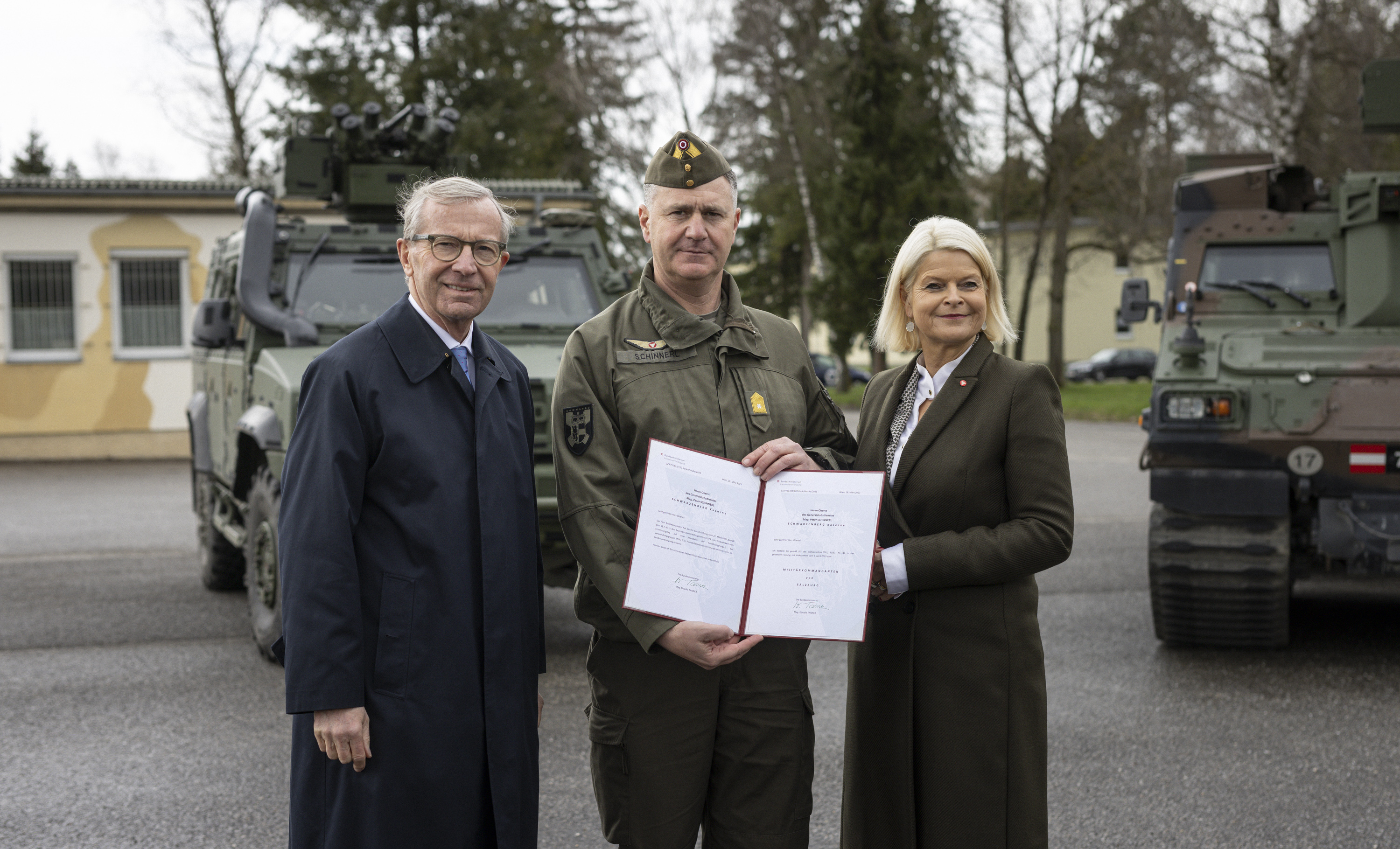 Heute, den 30. März 2023, fand in der Salzburger Schwarzenberg-Kaserne im Beisein von Verteidigungsministerin Klaudia Tanner, des Landeshauptmannes von Salzburg Wilfried Haslauer und des Generalstabschefs General Rudolf Striedinger, die Übergabe der Kommandoführung des Militärkommandos Salzburg statt. Dabei übergab der mit 1. April in den Ruhestand tretende bisherige Militärkommandant, Brigadier Anton Waldner, die Kommandoführung an den kurz davor zum Brigadier beförderten Peter Schinnerl.