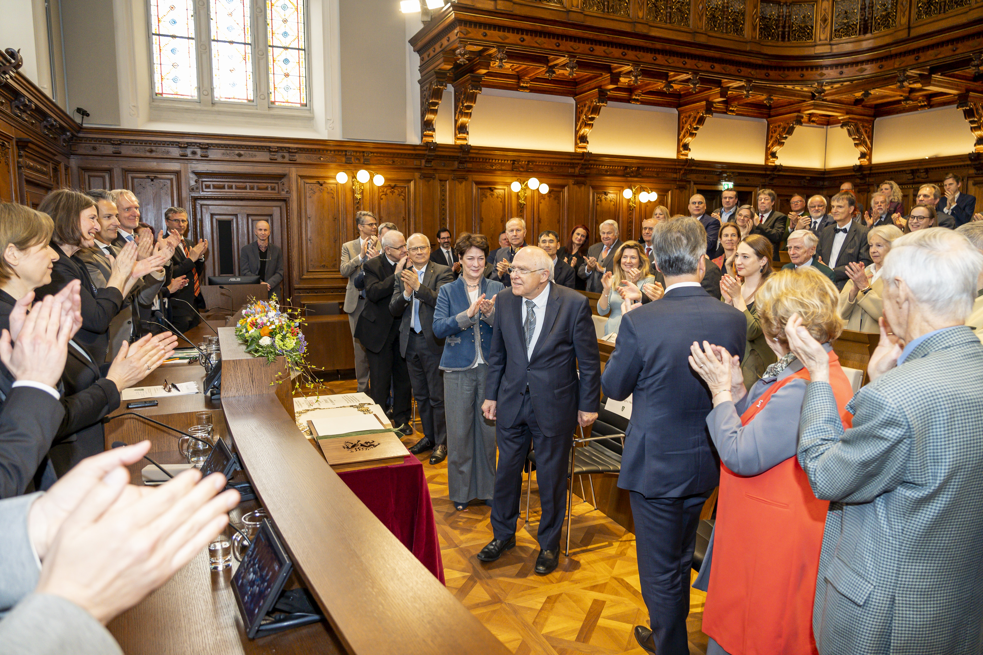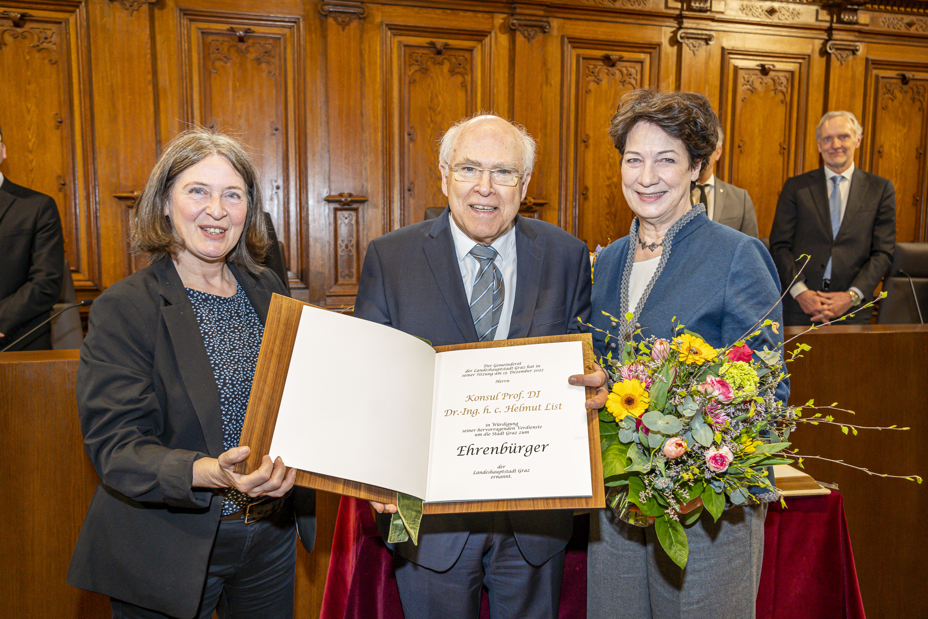 "Wir haben versucht, annähernd eine Biografie nachzuzeichnen, aber es ist nur ein Auszug. All das, was Sie geleistet haben, würde diesen Festrahmen sprengen." Mit diesen Worten leitete Bürgermeisterin Elke Kahr ihre Rede zur Ehrenbürgerernennung von Professor Helmut List ein. Zahlreiche Gäste aus Wirtschaft, Politik und Kirche fanden zur Festsitzung im Gemeinderatssitzungsssaal zusammen, darunter auch die Familie des Geehrten mit Gattin Kathryn List und den Kindern Katharina, Olivia und Hans. Die Ehrenbürger:innen Egon Kapellari, Waltraud Klasnic, Alfred Stingl und Siegfried Nagl wohnten der Festsitzung ebenso bei wie die Religionsvertreter Bischofsvikar Heinrich Schnuderl, in Vertretung von Diözesanbischof Wilhelm Krautwaschl, Superintendent Wolfgang Rehner und Imam Ibrahim Čikarić. Die Stadtregierung und Mitglieder des Gemeinderates sowie Landesrat Johann Seitinger in Vertretung von Landeshauptmann Christopher Drexler waren ebenso anwesend.