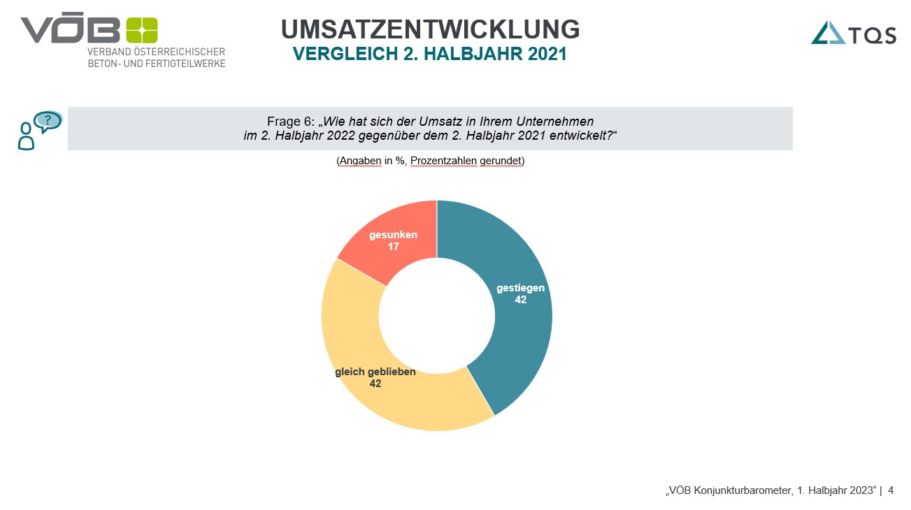 Die österreichische Betonfertigteilbranche konnte trotz einer schwierigen Konjunkturlage das Vorjahr stabil abschließen. So meldeten sogar 84 Prozent der befragten Unternehmen gleichbleibende oder steigende Umsätze im zweiten Halbjahr 2022 im Vergleich zum selben Zeitraum 2021. Die steigernden Umsätze sind bei einem Drittel der Befragten auf Preiserhöhungen aufgrund der gesteigerten Energie- und Rohstoffpreise zurückzuführen.