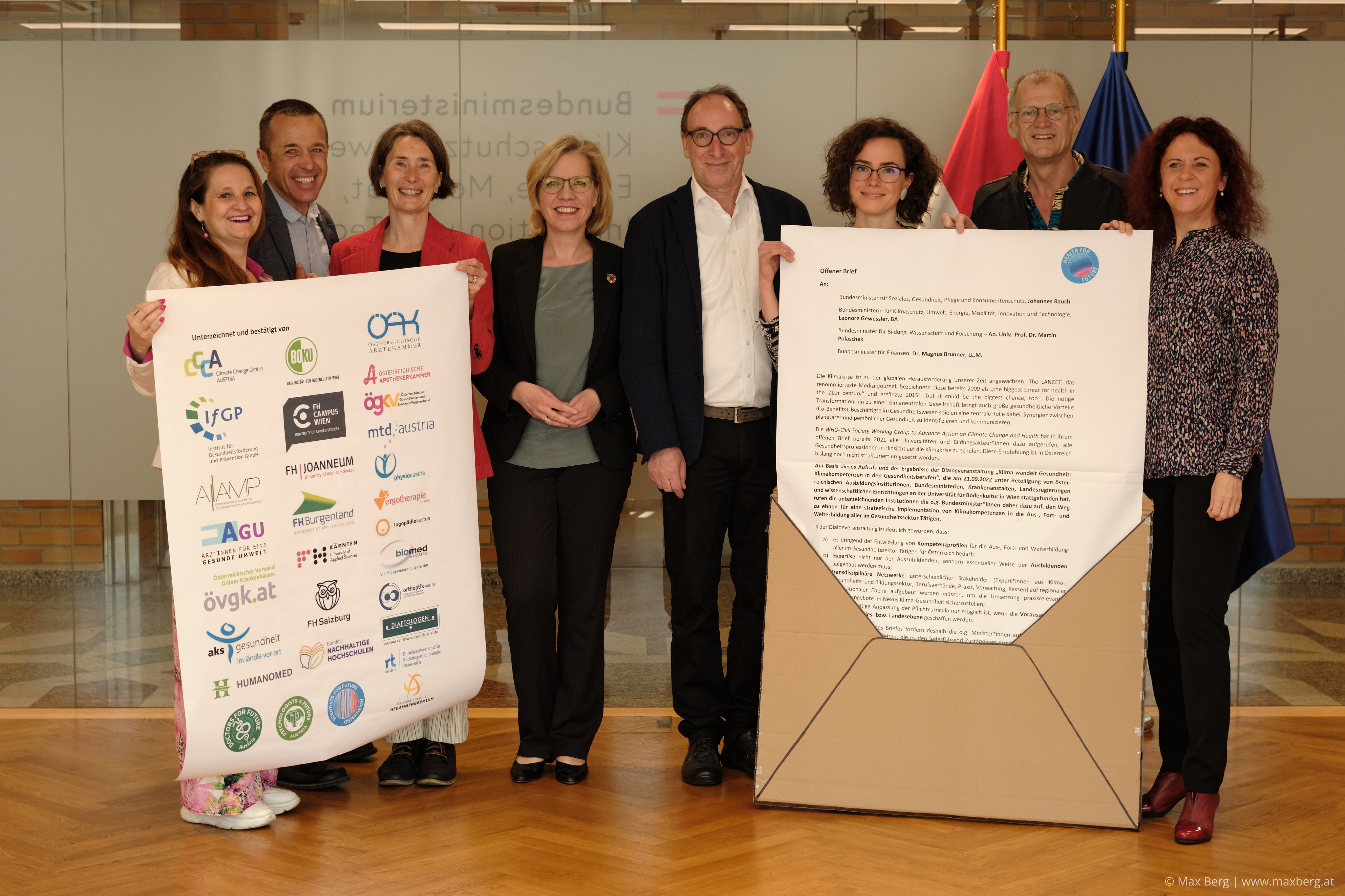 Ein breites Bündnis aus Vertreter:innen der Gesundheitsberufe hat am Freitag 21.4.2023 einen offenen Brief an die Klimaministerin Leonore Gewessler und den Gesundheitsminister Johannes Rauch übergeben. In diesem fordern Sie die Ministerien dazu auf, die Rahmenbedingungen für eine rasche Umsetzung von Klimakompetenzen in Aus-, Fort- und Weiterbildung aller im Gesundheitssektor Tätigen zu schaffen.