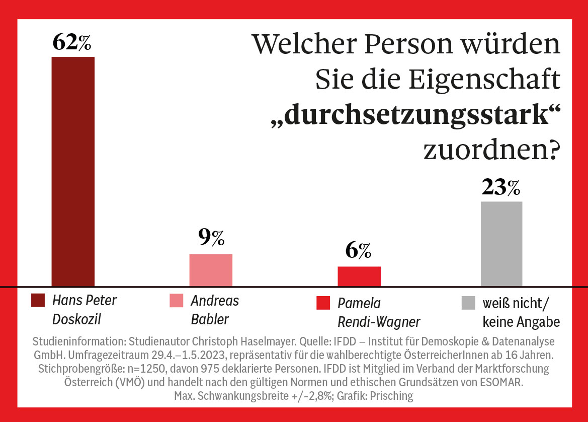 Bei der Eigenschafts-Frage zum Thema „Durchsetzungsfähigkeit“ verzeichnet Hans Peter Doskozil mit 62 Prozent Zustimmung generell den höchsten Wert, darunter stolze 69 Prozent der deklarierten Grün-Wähler, 64 Prozent der deklarierten ÖVP-Wähler und 61 Prozent der deklarierten SPÖ-Wähler. Andreas Babler liegt in Sachen „Durchsetzungsfähigkeit“ bei nur neun Prozent, Rendi-Wagner bei sechs.