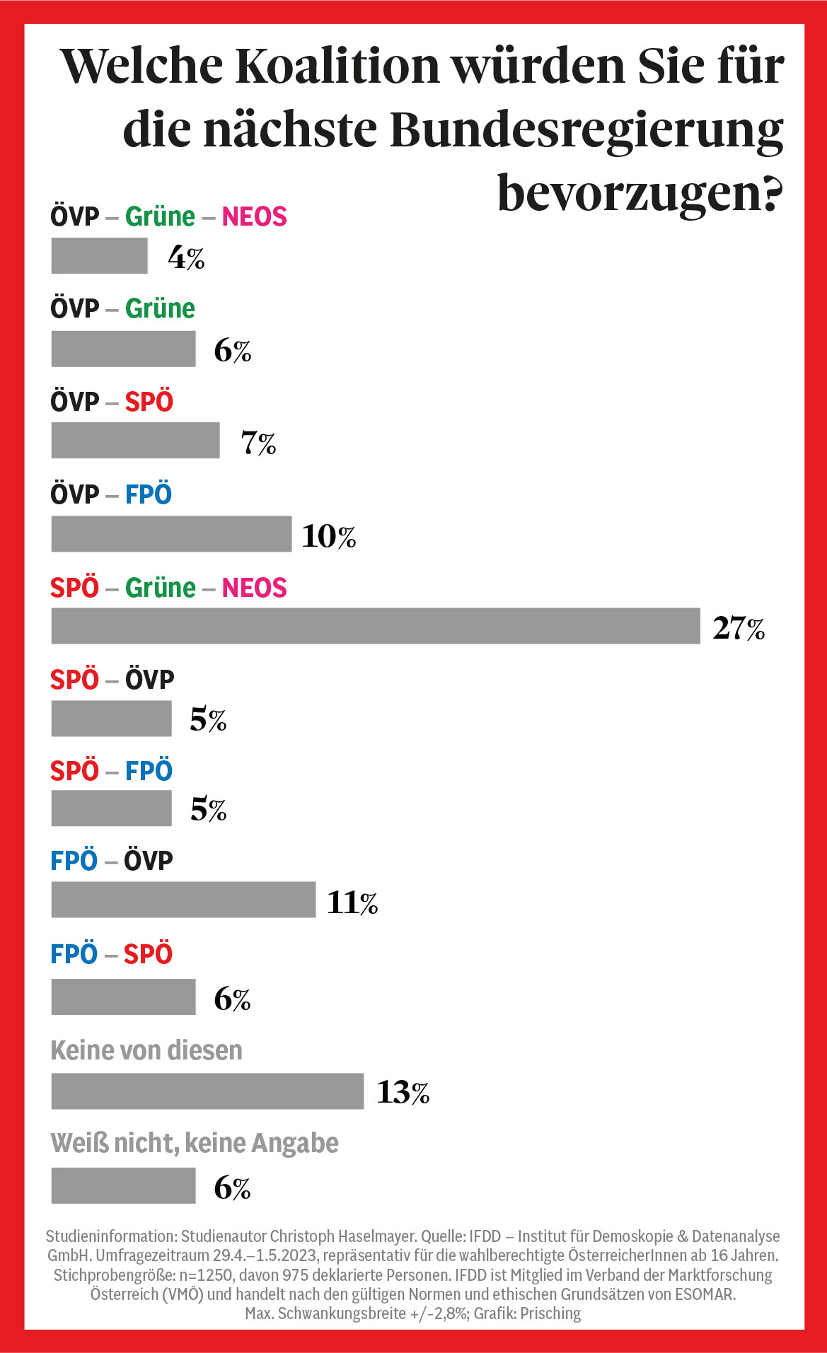 Quelle: IFDD – Institut für Demoskopie und Datenanalyse GmbH, Umfragezeitraum: 29. April bis 1. Mai; 1.250 Online-Interviews, repräsentativ für die wahlberechtigte österreichische Bevölkerung ab 16 Jahren, maximale Schwankungsbreite ± 2,8 Prozent. IFDD ist Mitglied im Verband der Marktforscher Österreichs und handelt nach den gültigen Normen und ethischen Grundsätzen von ESOMAR.