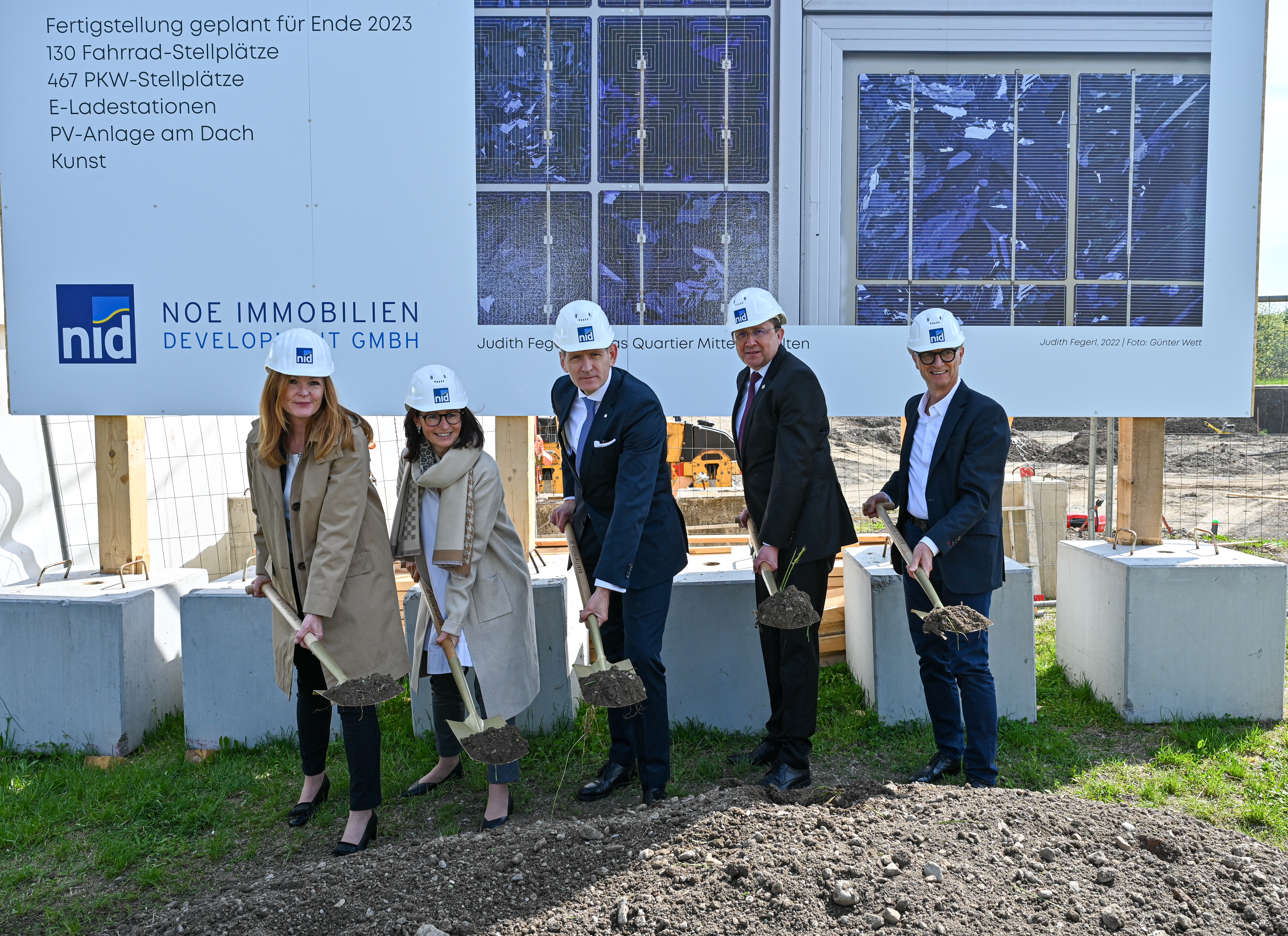 Die NOE Immobilien Development GmbH (NID), der Spezialist für hochwertiges Wohnen in Niederösterreich und Wien, feiert den Baustart für das Parkhaus „Quartier Mitte“ in der Landeshauptstadt St. Pölten. Am Kreisverkehr Willi-Gruber-Straße, an der Traisen, erfolgte im Beisein der für die künftige Fassadengestaltung verantwortlichen Künstlerin, Mag. Judith Fegerl, der Spatenstich für die Hochgarage durch den Bürgermeister der Stadt St. Pölten, Mag. Matthias Stadler, Claudia Pillwein, CMC CFM (finanzierende Bank RRB Mödling), Prok. Arch. DI Barbara Egert (AHP GmbH),Prok. Dir. Ing. Dieter Haderer (Generalunternehmer Arbeitsgemeinschaft „Q2 Parkdeck“ PORR - Oberndorfer) sowie Bmstr. Ing. Michael Neubauer (NID).