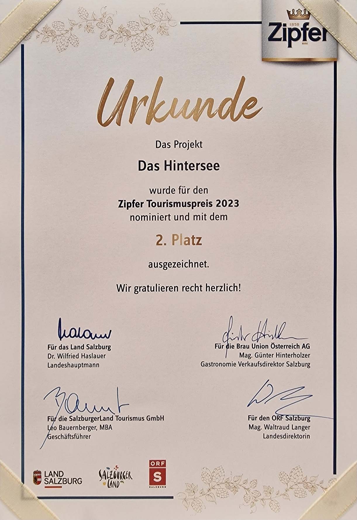 DAS Hintersee – Platz 2. im Rahmen des Zipfer Tourismuspreises 2023