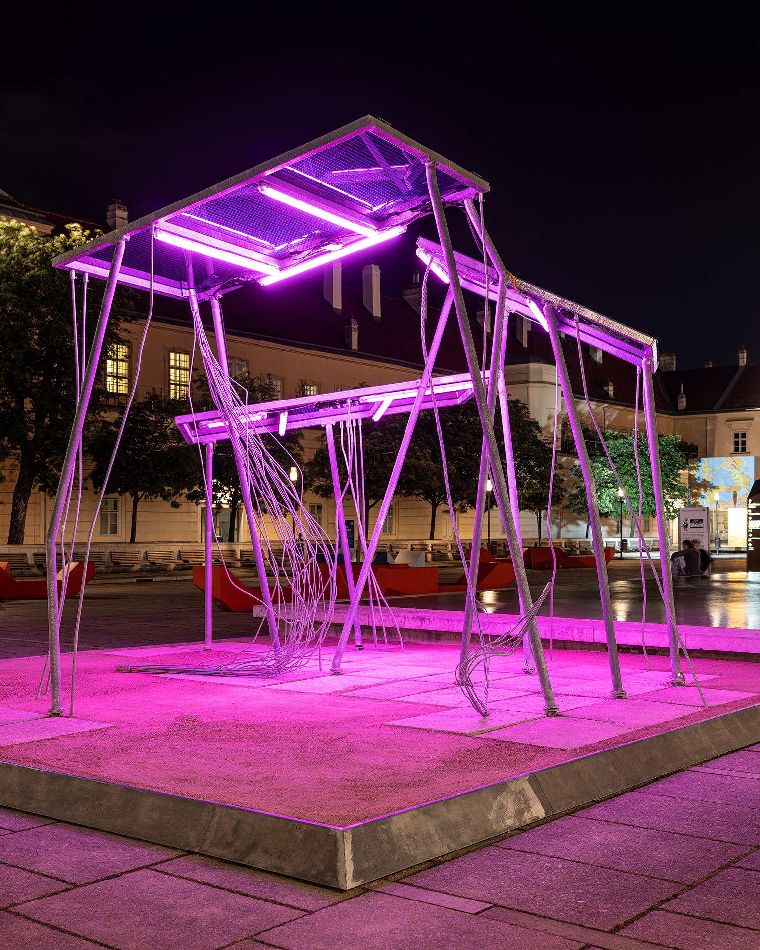 Während die Photovoltaikpaneele tagsüber Sonnenenergie in elektrische Energie umwandeln, die ins Stromnetz eingespeist wird, spendet die Skulptur den Besucher:innen Schatten. Nachts kehrt sich das Produktionsverhältnis um und die Skulptur wird zur Konsumentin der zuvor eingespeisten Sonnenenergie: Sie strahlt intensives Licht in violetter Farbe ab.