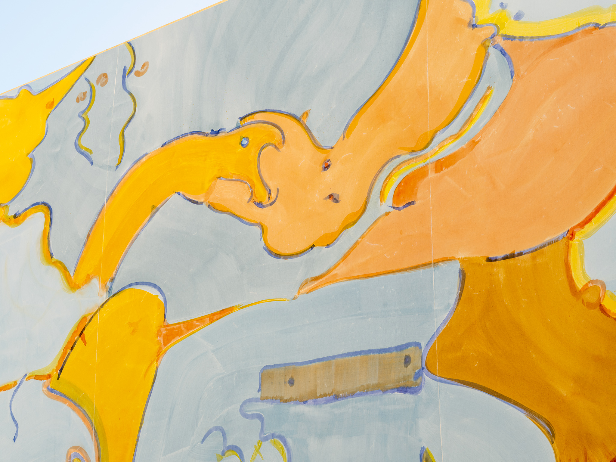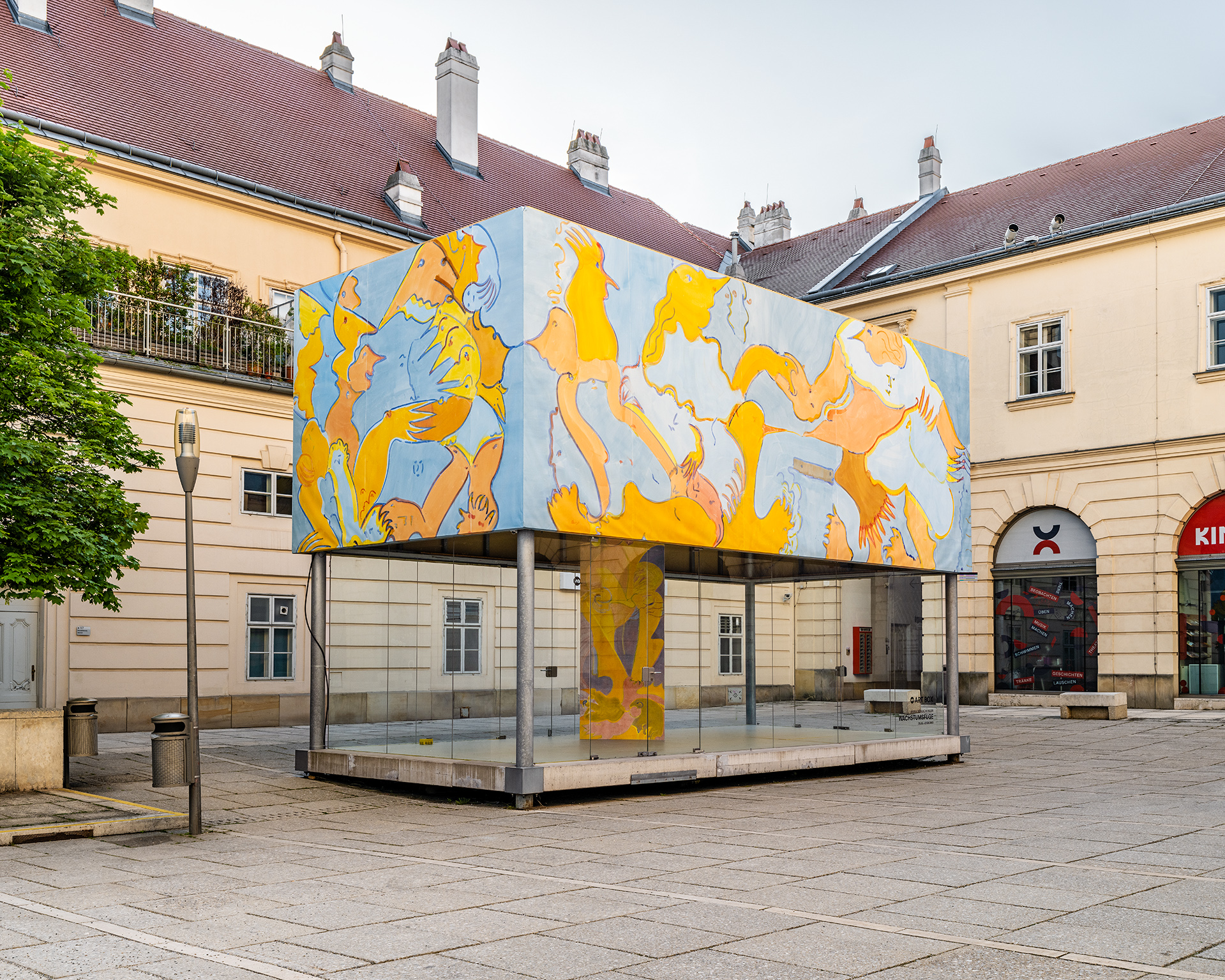 Fische, Vögel, Menschen und Monster – Anna Schachinger bespielt die MQ Art Box mit einer malerischen Erzählung, die sich wie ein Fries um den oberen Teil der Außenfläche legt. Nasenspitzen, Schnäbel, Fischmünder und Zeigefinger berühren sich exakt, treten miteinander in Kontakt und kommunizieren auf Augenhöhe. Die mythologischen Mischwesen befinden sich in Metamorphose –sie selbst sind es, die sich gegenseitig Leben einhauchen.