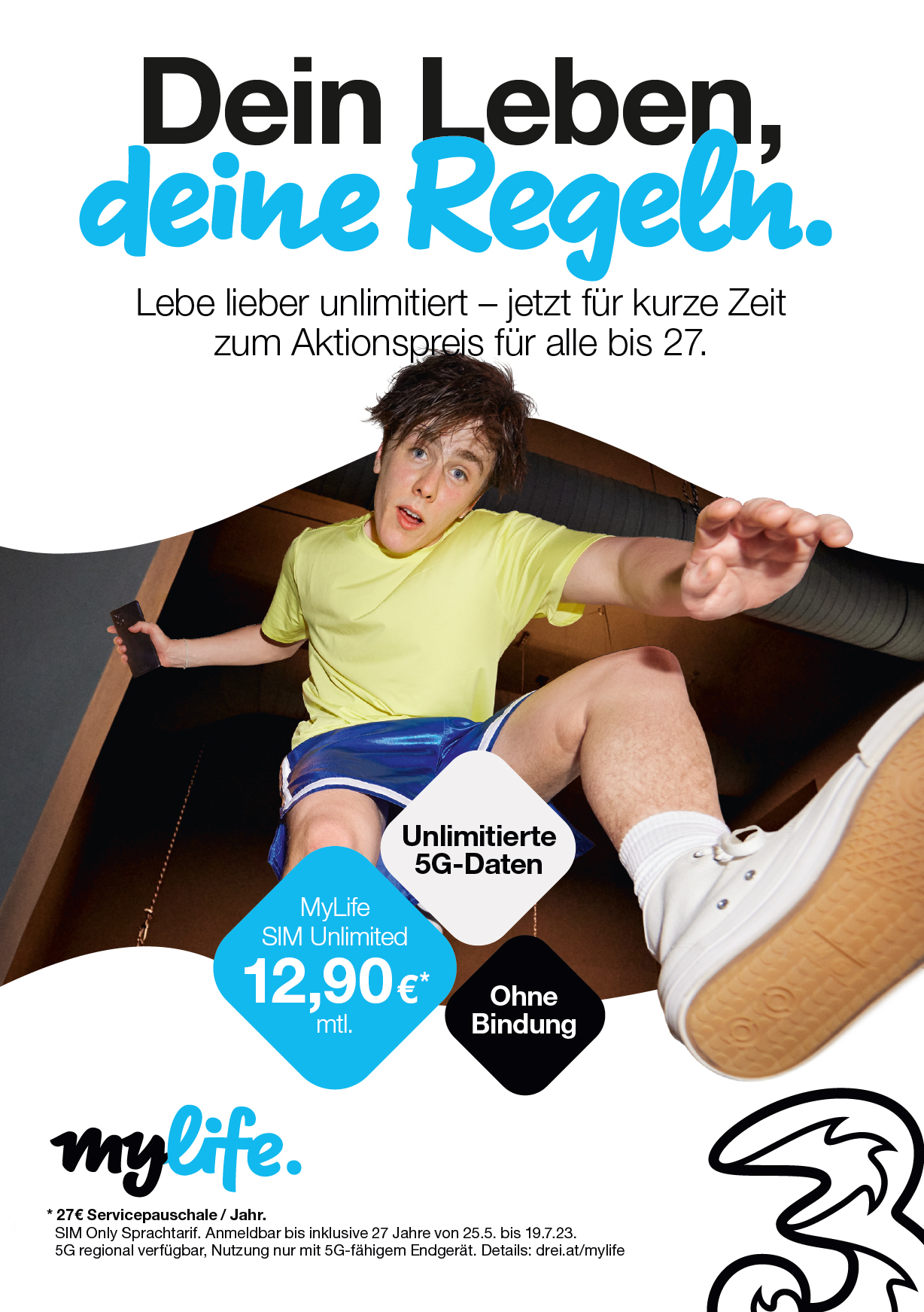 „Dein Leben, deine Regeln“: Unter diesem Motto bietet Drei Schülern und Studenten bis 27 Österreichs ersten unlimitierten 5G-Sprachtarif ohne Bindung.